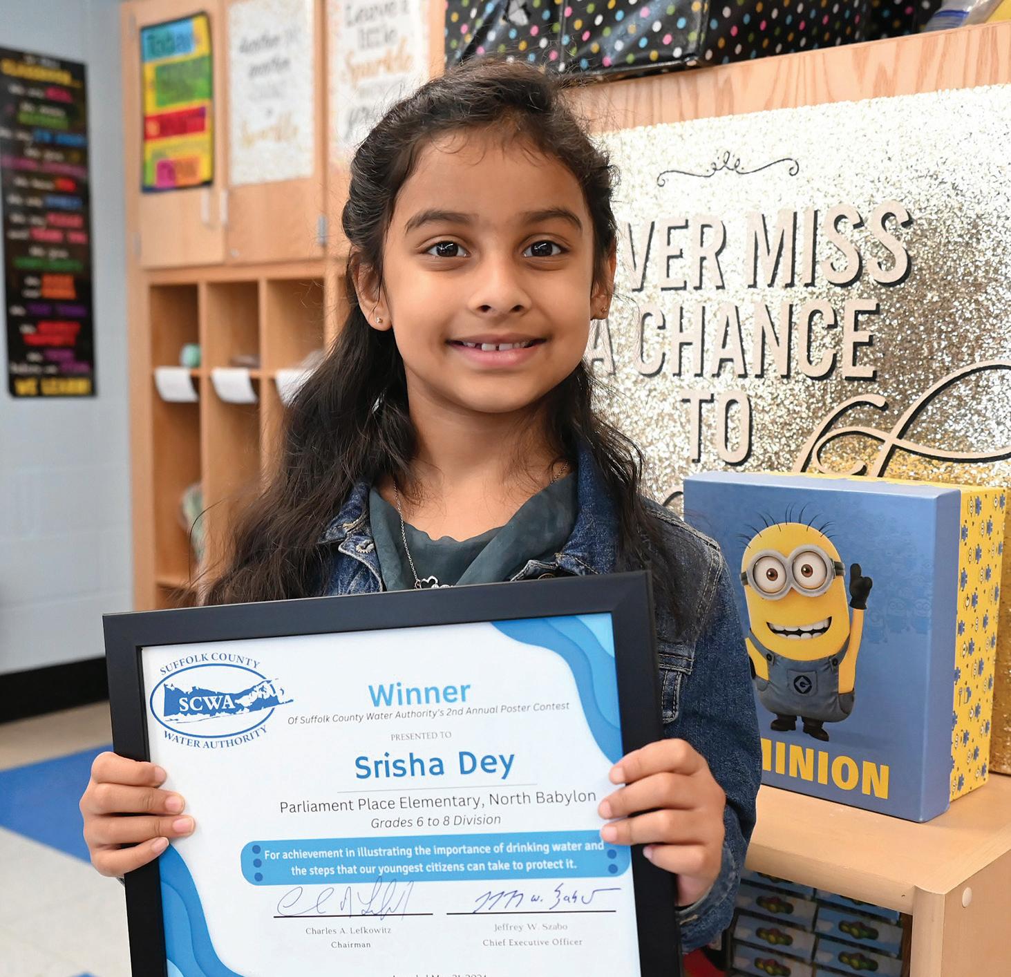 Srisha Dey, a first grader in Ms. Ivy’s class at Parliament Place Elementary School in the North Babylon School District, was recently named the first-place winner in the kindergarten to second grade division for her artwork in a poster contest sponsored by Suffolk County Water Authority. Her artwork illustrated the importance of drinking water and the steps that younger citizens can take to protect the water. Photo courtesy of North Babylon School District