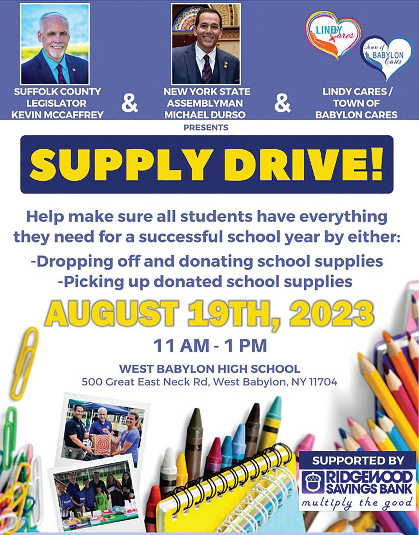 School items collected by individuals or companies can be delivered by August 18 to: United Way of Long Island, 819 Grand Boulevard, Deer Park (Next to Tangier Outlets Deer Park). Drop-Off I-lours: Monday - Thursday 10am - 5pm