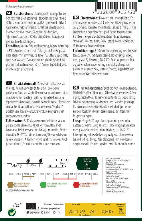 616 Asters American Branching mix 7312600006164 B 620 Asters Dwarf chrysanthemum mix 7312600006201 D 635 Asters 'Princess' mix 7312600006355 D 660 Asters Chinensis mix 7312600006607 A 665 Asters Semi-Tall mix 7312600006652 D 973 Blomkarse, Stor 7312600009738 B 975 Blomkarse, Stor 'Out of Africa' 7312600009752 D 986 Blomkarse, Stor Tom Thumb 7312600009868 D 998 Blomkarse, Stor Glorius Gleam 7312600009981 D 994 Blomkarse, Stor 'Scarlet Gleam' 7312600009943 D 1073 Blomsterert Royal Mix Duftende 7312600010734 B 1080 Blomsterert Knee-Hi Duftende 7312600010802 D 1045 Blomsterert 'Royal Scarlet' Duftende 7312600010451 D 1049 Blomsterert 'Royal Rose' Duftende 7312600010499 D 1058 Blomsterert 'Royal Blue' Duftende 7312600010581 D 1450 Brudeslør 7312600014503 B 783 Busknellik Mix 7312600007833 B 1129 Dagfiol Duftende 7312600011298 A 1537 Fløyelsblomst 'Bolero' 7312600015371 D 1542 Fløyelsblomst 'Carmen' 7312600015425 D 1547 Fløyelsblomst 'Petite' 7312600015470 D 1554 Fløyelsblomst, Busk- 'Starfire' 7312600015548 D 894 Forglemmegei 7312600008946 D 1744 Høststråblomst 7312600017443 A 935 Klokkeranke 7312600009356 D 750 Kornblomst 'Blue Boy' 7312600007505 B 924 Kornblomst Mix 7312600009240 A 926 Kornblomst 'Polka Dot' 7312600009264 D 483 Lavendel Duftende 7312600004832 D 1094 Levkøy, Sommer- 'Ten Week' Duftende 7312600010949 A 1033 Lobelia, Kant- 'Emperor William' 7312600010338 D 708 Mix, Engblomster Nelson Mixture 7312600007086 D 1704 Mix, Evighetsblomster Nelson Mixture 7312600017047 D 705 Mix, Slyngplanter Nelson Mixture 7312600007055 D 687 Mix, Sommerblomster Nelson Mixture 7312600006874 B 690 Mix, Sommerblomster Blue Shades 7312600006904 D 692 Mix, Sommerblomster Pink Shades 7312600006928 D 1107 Månedslavatera 'Mont Blanc' 7312600011076 D 1110 Månedslavatera 'Silver Cup' 7312600011106 D 1291 Prestekrage 'Maikönigin' 7312600012912 D 1020 Prydløvemunn 7312600010208 B 1294 Puslingkrage 7312600012943 B 1755 Pyntegresskar 7312600017559 D 1365 Pyntekorg 'Early Summer' 7312600013650 D 1366 Pyntekorg Vega Mixture 7312600013667 D 1371 Pyntekorg 'Purity' 7312600013711 D 843 Revebjelle 7312600008434 B 1326 Ringblomst 'Ball´s Orange' 7312600013261 B 1330 Ringblomst 'Radio' 7312600013308 B 1334 Ringblomst 7312600013346 B 1338 Ringblomst 'Pacific Beauty' 7312600013384 D 1349 Ringkrage 7312600013490 B 1635 Sinnia 'Sunbow mixed' 7312600016354 D 1639 Sinnia 7312600016392 D 1410 Solsikke Wilde mixture 7312600014107 D 1414 Solsikke 'Uniflorus' 7312600014145 B 1416 Solsikke 'Moonwalker' 7312600014169 D 1418 Solsikke 'Waooh !' 7312600014183 E 1423 Solsikke 'Sunspot' 7312600014237 D 1196 Stemorsblomst Hiemalis 7312600011960 B 1229 Stemorsblomst 'Florist Strain' 7312600012295 D 1469 Stokkrose 'Chaters Double' 7312600014695 D 1104 Stokkrose, Sommer- 7312600011045 B 1603 Valmue, Korn- 7312600016033 D 1606 Valmue, Pion- 7312600016064 B 1487 Vingethunbergia 7312600014879 D 1278 Øyeblomst 7312600012783 D 147 Løk, Salat- 'White Lisbon' 7312600001473 D 155 Mainepe 'Snowball' 7312600001558 B 165 Mais, Sukker- 'Tasty Sweet' F1 7312600001657 D 430 Oregano, Gresk Greek 7312600004306 D 502 Oregano/Bergmynte 7312600005020 D 211 Pastinakk 'White Gem' 7312600002111 D 514 Persille 'Moss curled 2' 7312600005143 B 518 Persille, Blad- 'Comun 3' 7312600005181 B 152 Purre 'Blaugrüner Winter' 7312600001527 D 145 Purre 'Herbstriesen 2' 7312600001459 B 225 Reddik 'Saxa 2' Såbånd 7312600002258 E 228 Reddik 'Cherry Belle' 7312600002289 A 229 Reddik 'French Breakfast 3' 7312600002296 D 232 Reddik 'Københavns Torve 2' 7312600002326 B 236 Reddik Mix 7312600002364 D 527 Rosmarin 7312600005273 D 265 Ruccola Rucola 7312600002654 D 71 Rødbete 'D' Egypte' 7312600000711 B 240 Rødbete 'Forono' 7312600002401 B 245 Rødbete Hullahoop mix 7312600002456 D 237 Rødbete 'Chioggia' 7312600002371 D 238 Rødbete 'Detroit 2' 7312600002388 A 246 Salat, Baby Leaf Baby Leaf mix 7312600002463 D 247 Salat, Blad- 'Lollo Rossa' 7312600002470 D 256 Salat, Hode- 'Hilde II' Såbånd 7312600002562 E 274 Salat, Hode- 'Attractie' 7312600002746 B 259 Salat, Is- 'Great Lakes 118' 7312600002593 B 260 Salat, Plukk- 'Amerikanischer brauner' 7312600002609 B 261 Salat, Plukk- 'Salad Bowl' 7312600002616 D 262 Salat, Plukk- 'Red salad bowl' 7312600002623 D 275 Salat, Plukk- 'Australische Gele' 7312600002753 D 263 Salat, Romano- 'Lobjoits Green Cos' 7312600002630 D 277 Salat, Vinter- 'Verte de Cambrai' 7312600002777 B 271 Selleri, Stilk- 'Golden Self Blanching 2' 7312600002715 A 285 Spinat 'Matador' 7312600002852 B 288 Spinat, Nyzealandsk Neuseelaender 7312600002883 B 293 Squash 'Diamant' F1 7312600002937 D 294 Squash 'Soleil' F1 7312600002944 D 542 Timian, Krydder- 7312600005426 D 305 Tomat, Høy 'Gardener´s Delight' 7312600003057 D 306 Tomat, Høy 'Moneymaker' 7312600003064 B 312 Tomat, Høy 'Sparta' F1 7312600003125 E 313 Tomat, Høy 'Tigerella' 7312600003132 D 314 Tomat, Høy 'Marmande VR' 7312600003149 A 325 Tomat, Høy 'Shirley' F1 7312600003255 E 321 Tomat, Potte- 'Tiny Tim' 7312600003217 D 304 Tomat, Potte- 'Balkonzauber' 7312600003040 D ART. NO SORT EAN PRISGRUPPE ART. NO SORT EAN PRISGRUPPE 229 NELSON GARDEN