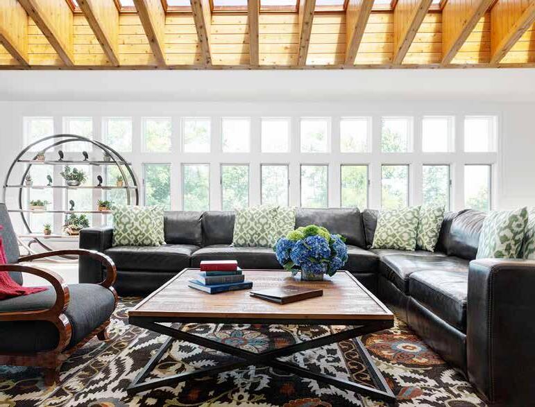 A warm space adjacent to the Mystic Rock golf course, featuring floor-to-ceiling windows