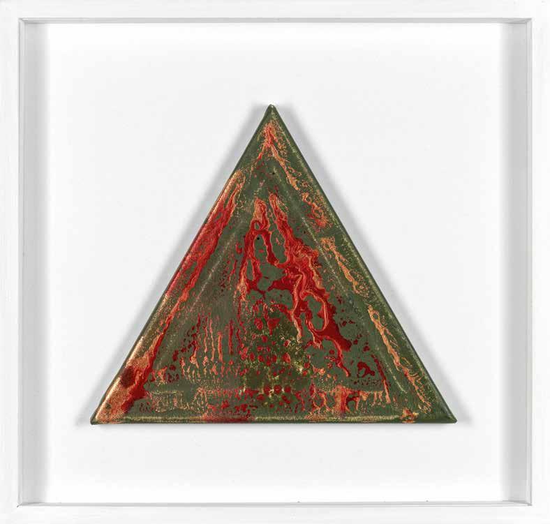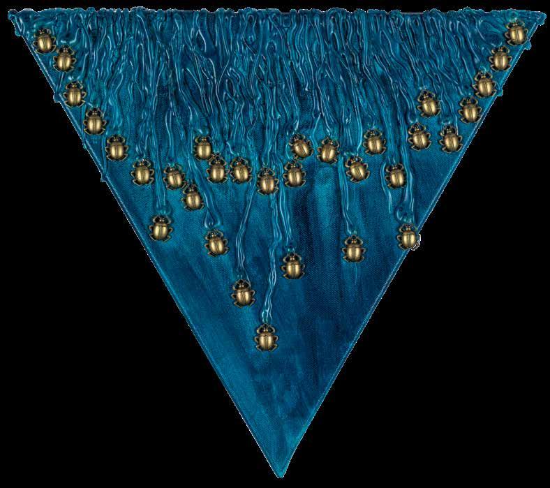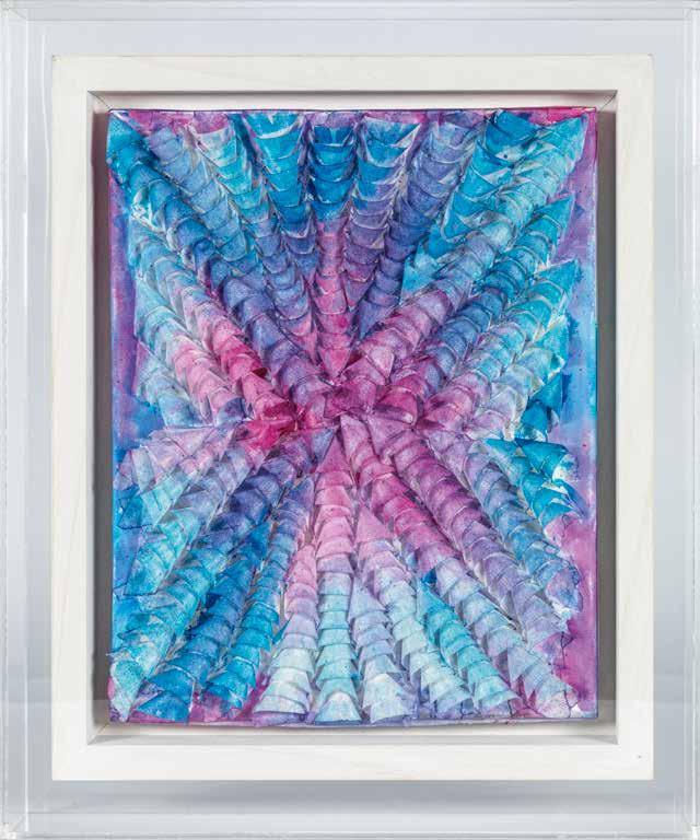 The inlaid natural elements, selectively arranged on the painted surface, dazzle the viewer with their unexpected presence within the composition as they administer volume and vitality.