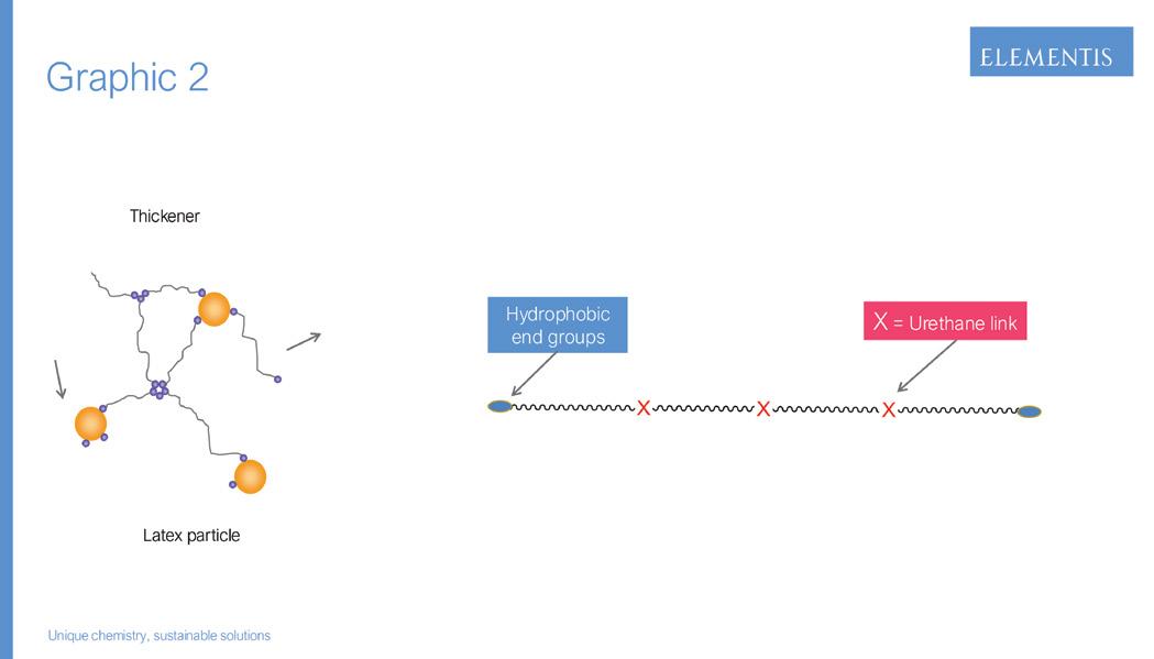 thickener provides shear thinning flow with a strong effect of the low shear viscosity. In the case of less hydrophobic end groups, the molecule focusses on the high shear paired with Newtonian flow driven viscosity by its hydrodynamic volume. In this case, typically the loading levels are higher due to the less pronounced hydrophobicity compared to pseudoplastic grades.