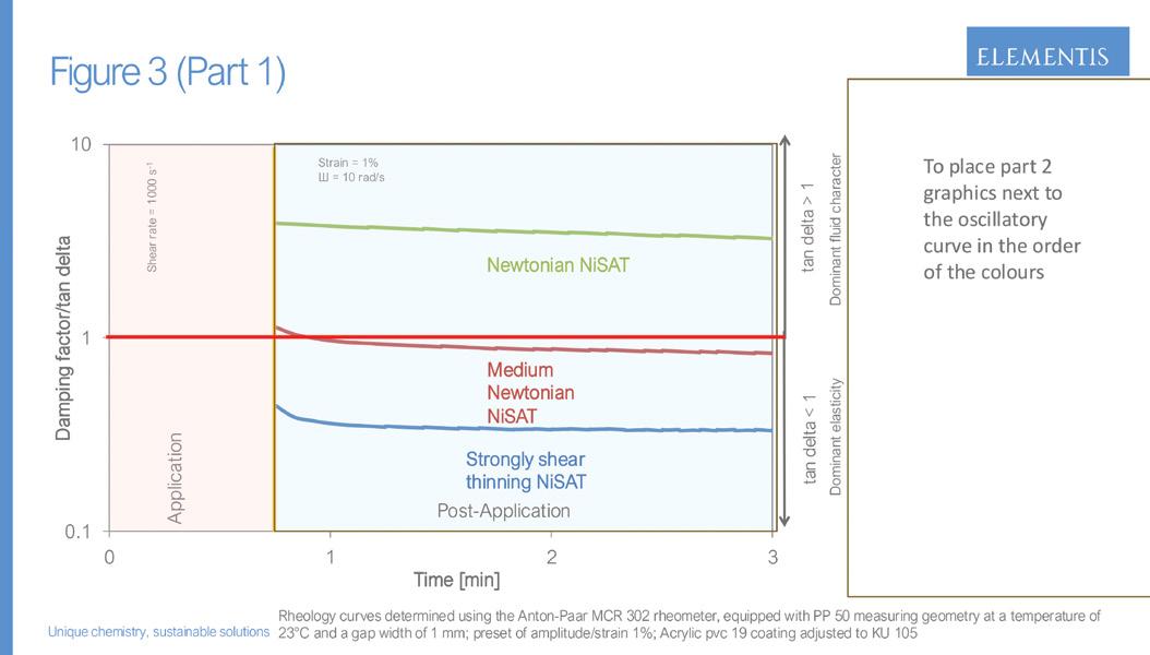 In the case of the strongly pseudoplastic NiSAT grade, the tan delta value acts significantly below one indicating a strong elastic character. In a context with the application results, this guides to good sag control, however, levelling and spatter resistance, were a bit inferior.