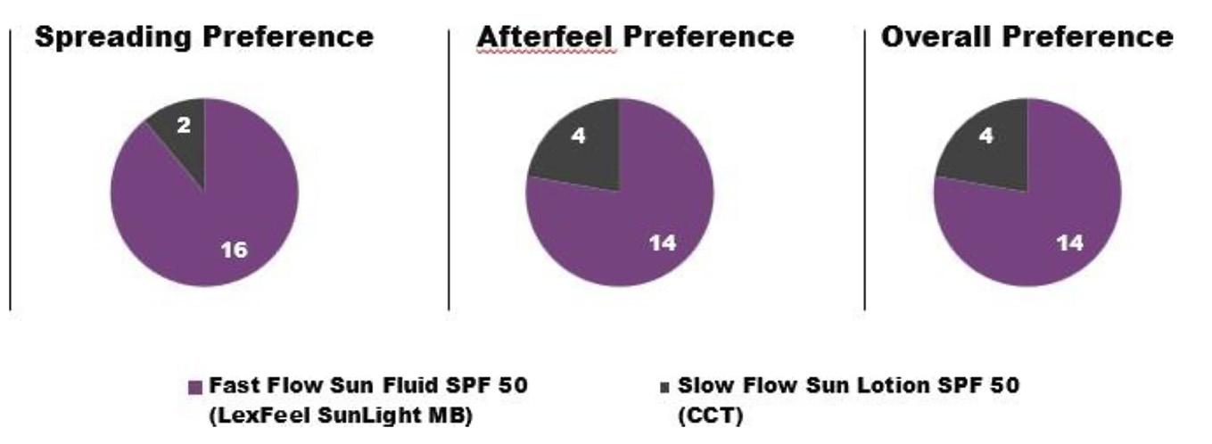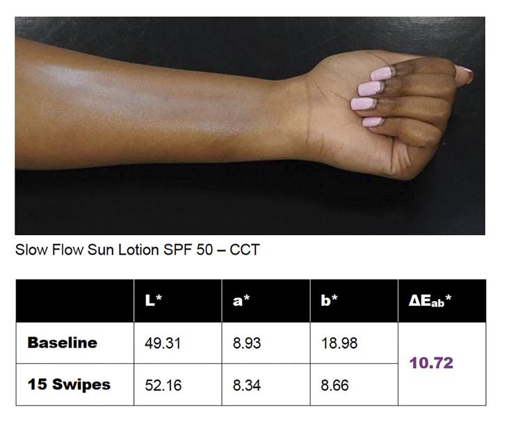 Less white cast with Fast Flow Sun Fluid SPF50. Similar b* value compared to baseline after 15 swipes. A 59% lower ΔEab* compared to Slow Flow Sun Lotion SPF50. White cast reduction was quantifiable, with up to 59% improvement compared to conventional dispersions.