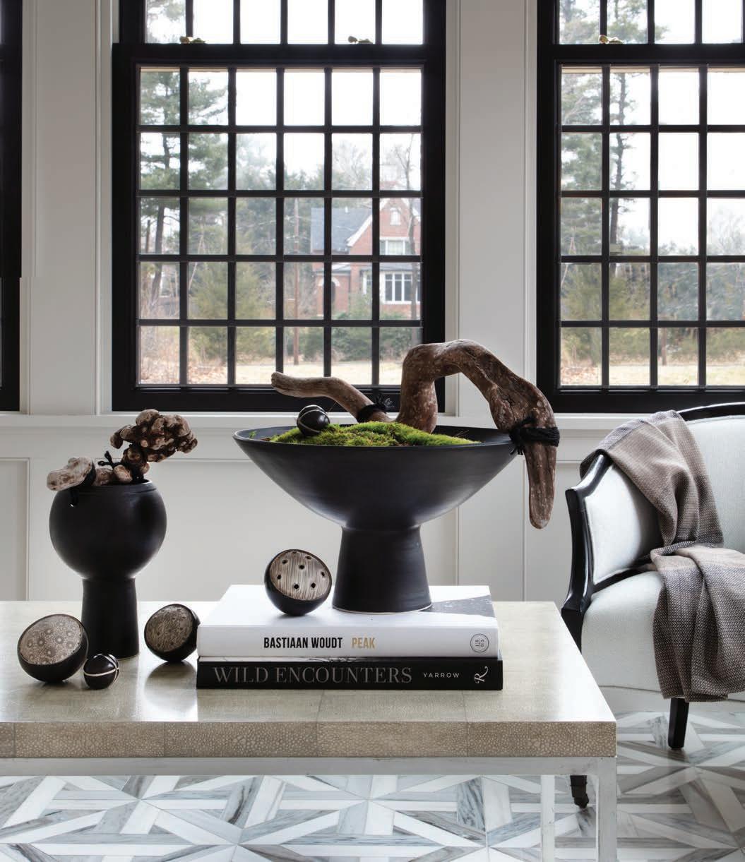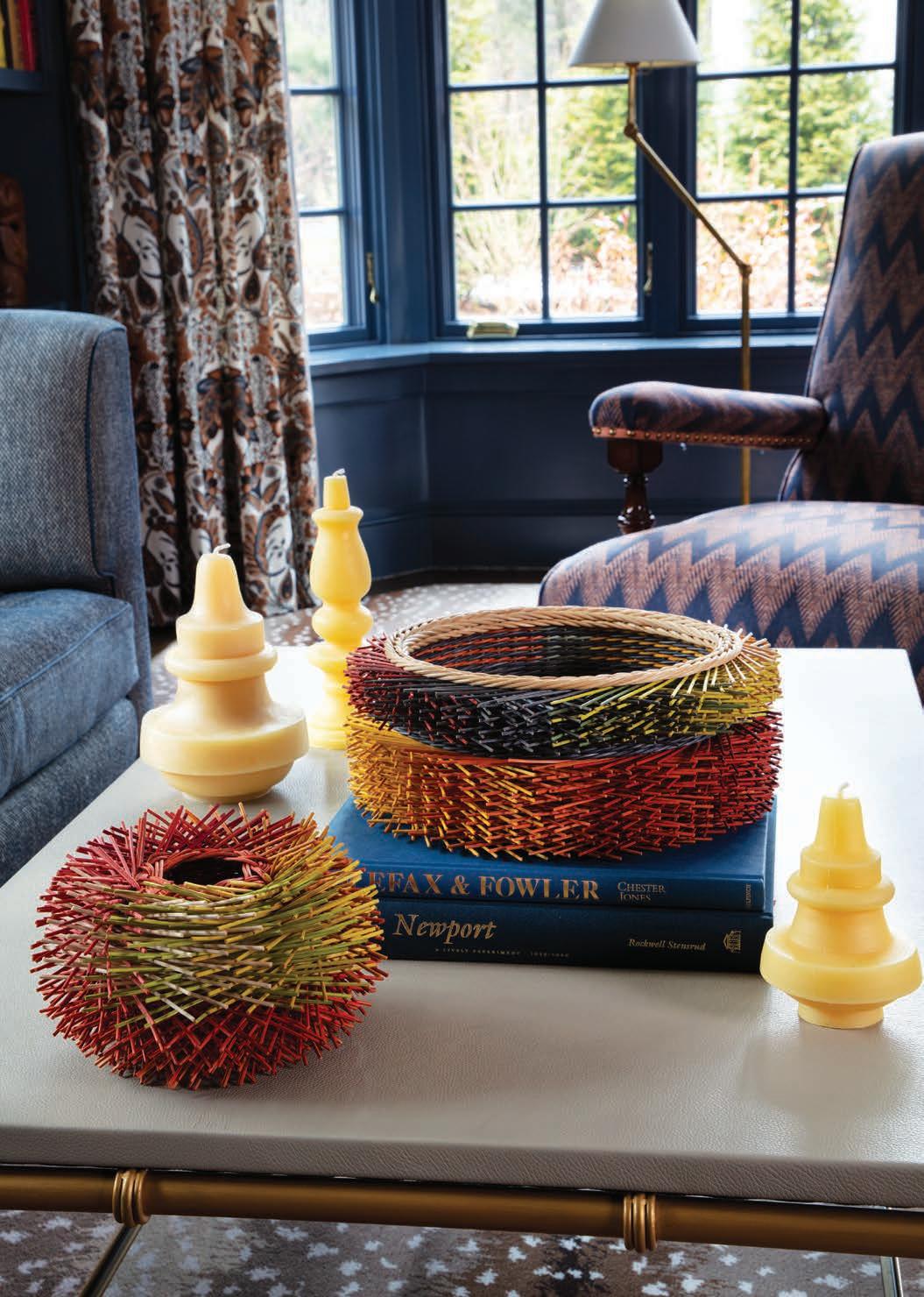 Pottery from Lauren Gelgor Kaplan’s Twigs and Twine series makes a dramatic statement. The handthrown white-ceramic pieces are finished with a matte-black glaze. Kaplan incorporates collected driftwood that has been treated for indoor use. The five pods below the vessels are part of Berkshires-based ceramicist Paula Shalan’s Pod series. Each one is smoke fired, which lends an earthy color palette. A cozy throw handwoven by Humble Linens adds a layer of softness to the room. Street School and the Rhode Island School of Design.