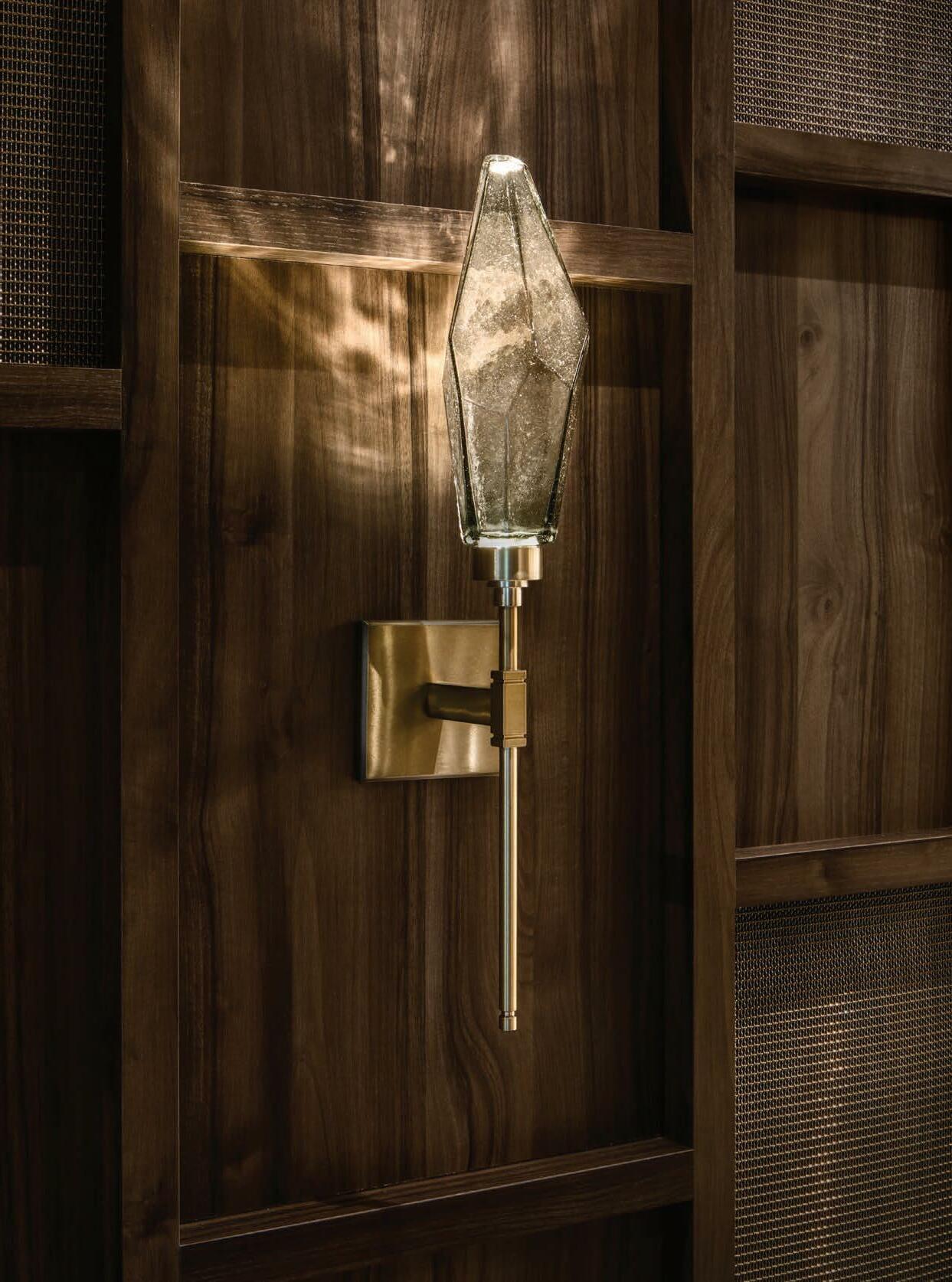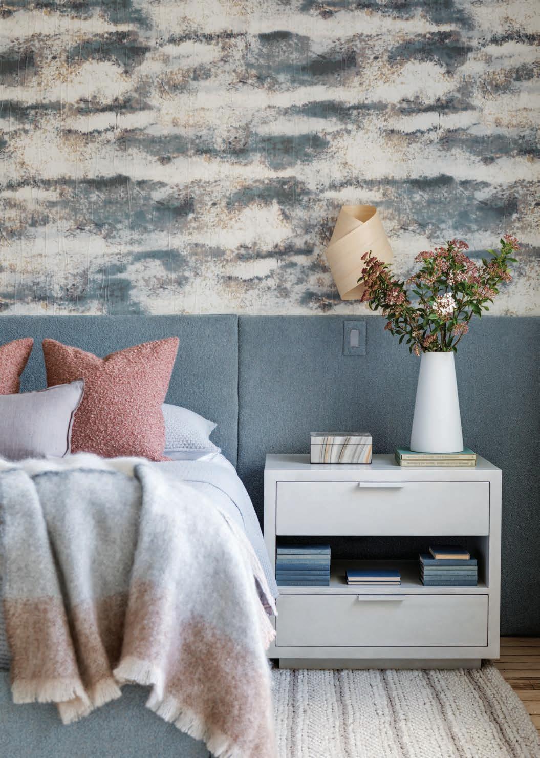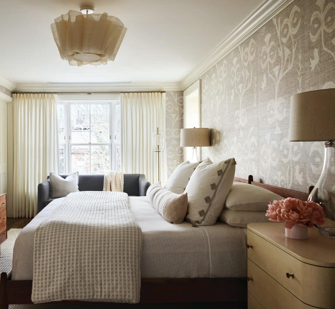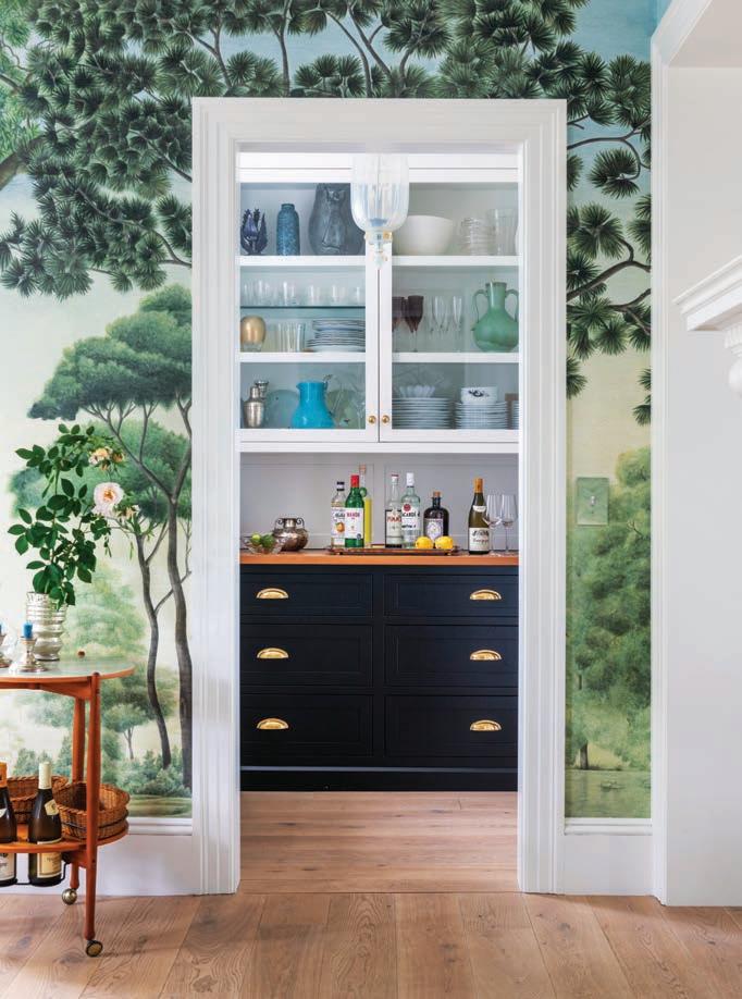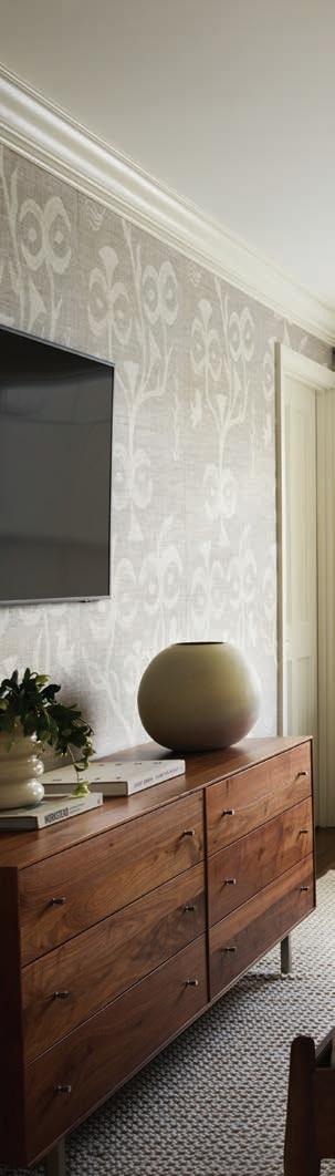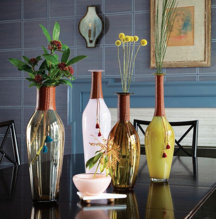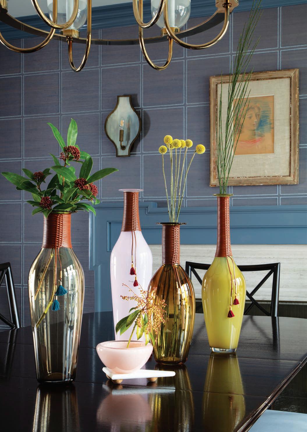 A selection of handblown leather-bound vessels by Providence glassblower Jon Watanabe demonstrates the impact of massing like objects or collections. The ikebana vase, also by Watanabe, beautifully displays a simple Japanese-inspired floral arrangement. Interior designer Kate Coughlin wrapped the room in Crezana’s embroidered Bowden Square wallcovering.