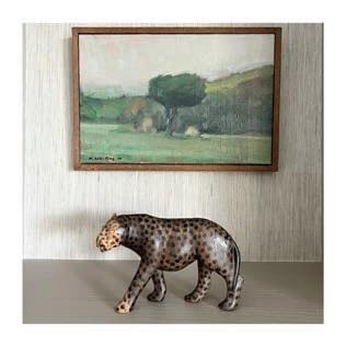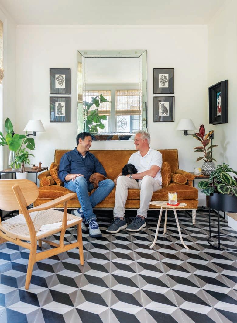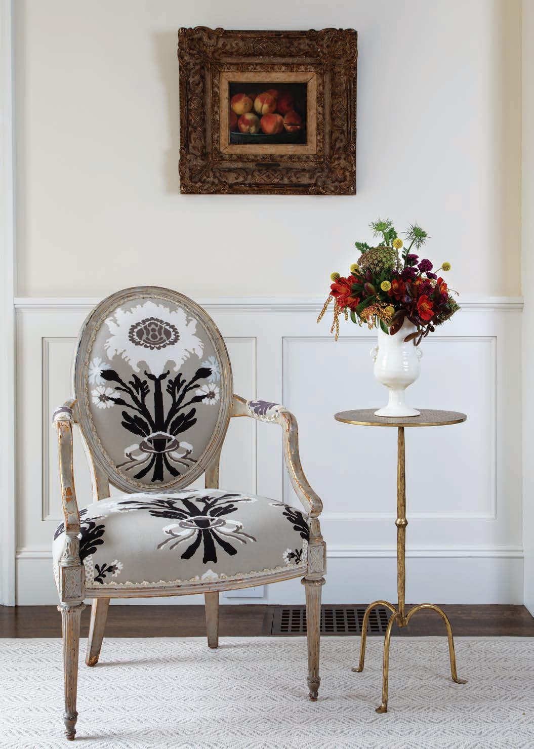 Frances Palmer’s Four Ear Vase adds a whimsical note to the traditional living room. The ceramicist’s pieces have garnered a cult following due in part to Palmer’s thoughtful Instagram account. The chair is a Louis XIV gilt fauteuil armchair (circa 1930–1940) purchased at The Barn at 17 Antiques in Woburn, Massachusetts, and reupholstered in Pierre Frey’s Victor Hugo–Imprimé fabric. The stylized floral pattern complements the lines of the vase.