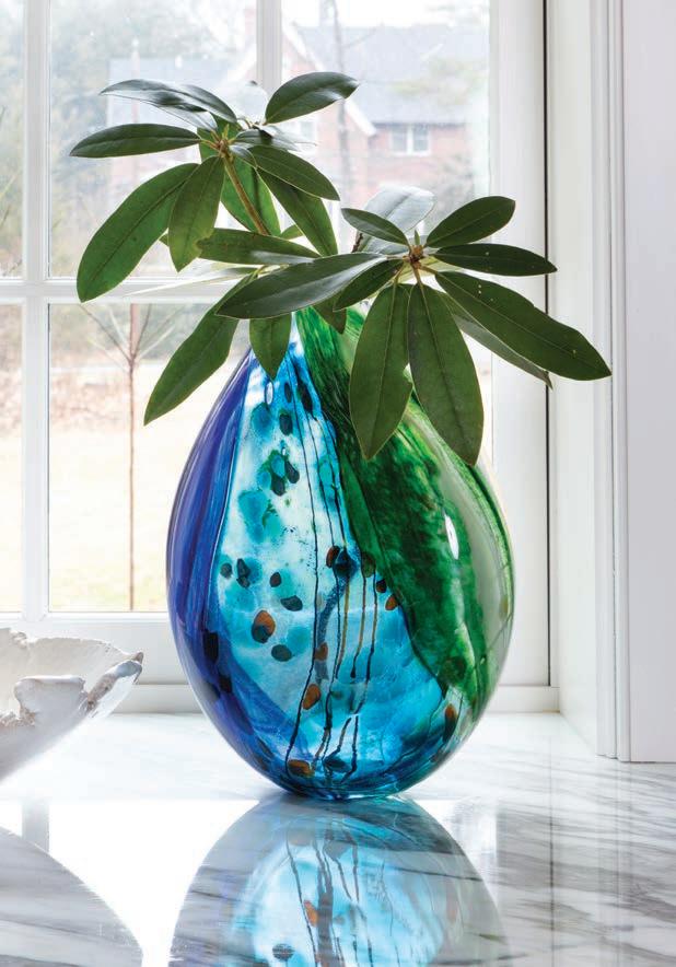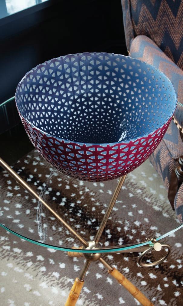 RIGHT: Light streams through a glass vessel blown by Randi Solin, whose work has been shown in museums and galleries worldwide. You can see Solin in action at Fire Arts Vermont in Brattleboro, a studio and gallery she founded with fellow artist Natalie Blake. BELOW: Rhode Island School of Design graduate Carrie Gustafson’s Lattice Bowl demonstrates the artist’s prowess with intricate detail and light reflection. The rug is Antelope Ax by Stark.