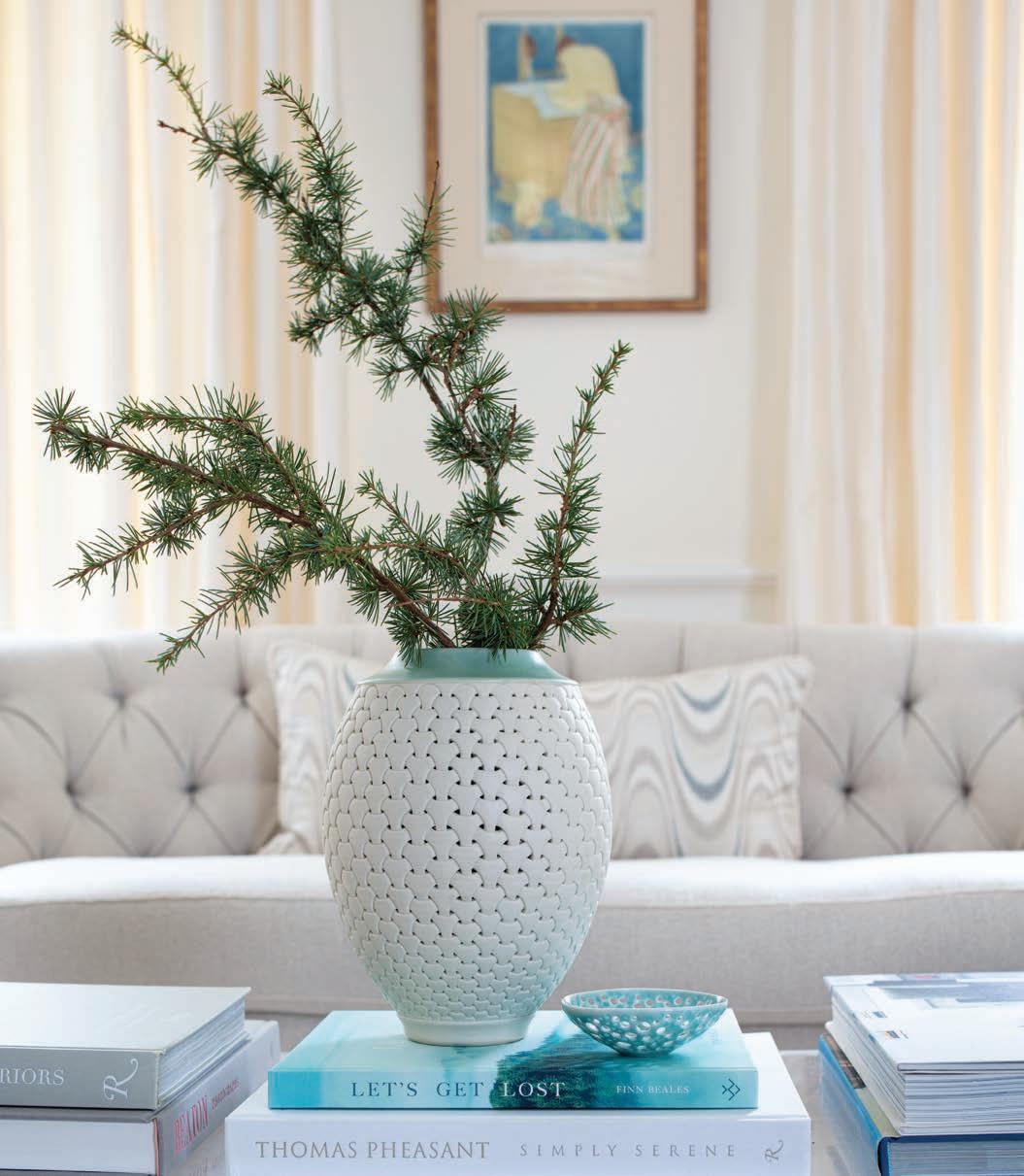 ABOVE: With a unifying all-white palette, these four pieces from Warner Wolcott’s Magnolia Studio and Warner Wolcott Ceramics feel graphic and sophisticated. The key to artful styling, says Karin Lidbeck Brent, is balancing various shapes, sizes, and heights to provide visual interest. LEFT: An inlayed antique nineteenth-century chest from Autrefois Antiques in Brookline, Massachusetts, acts as an elegant perch for Anna Kasabian’s High Tide at Island’s Cove. The sea provides infinite inspiration for Kasabian’s undulating porcelain forms.