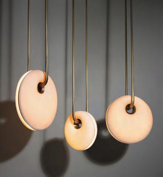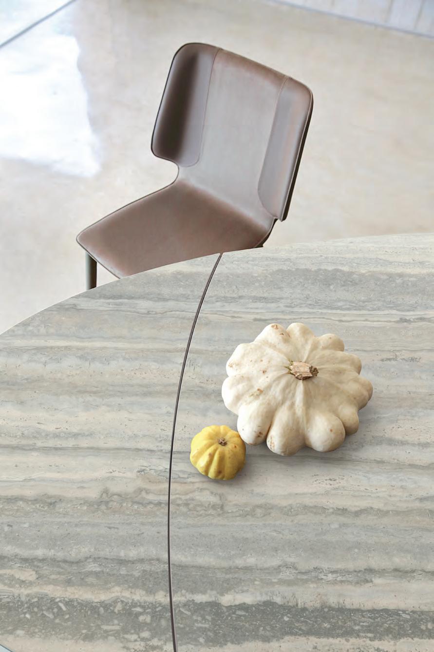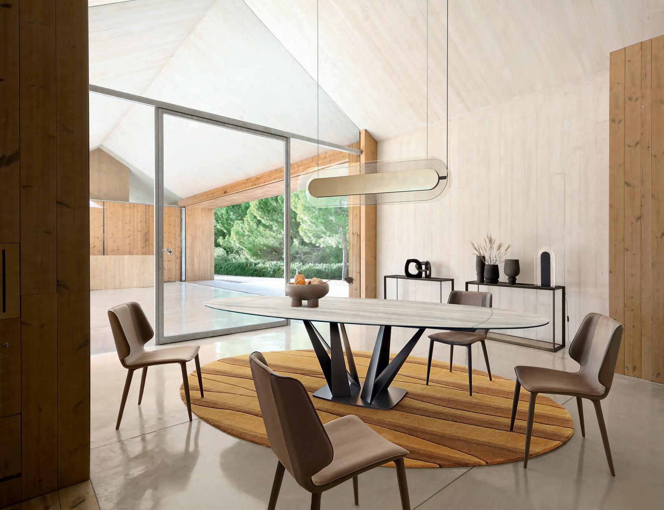 Alliage. Dining table, designed by Andrea Casati. Kasuka. Chairs, designed by Maurizio Manzoni. Dorienne. Suspension and table lamp, designed by Martino Sasso. Dune. Rug, designed by Emmanuel Gallina.