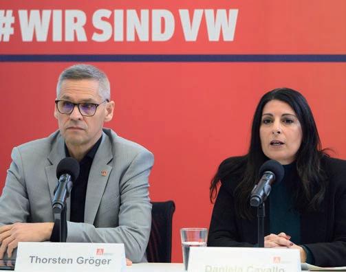 11月20日記者会見した、IGメタルのトルステン・グレーガー氏(左)とVW事業所評議会の ダニエラ・カヴァッロ議長(右)