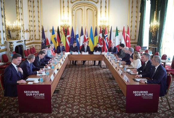 (ロンドン 3月3日 時事)2日にロンドンで開かれた 欧州主要国の首脳会合は、ロシアの侵攻を受けるウク ライナの安全を保証するための「有志連合」形成で合 意し、和平に向けた結束を誇示した。米国で政権に返 り咲いたトランプ大統領が対ロ融和姿勢を示し、ウク ライナを巡る「米欧対ロシア」の構図が一変。米国が離 反しかねない状況に対する欧州の危機感が浮き彫りに なった。