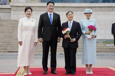 スフバートル広場で、フレルスフ大統領夫妻と歓迎式典に臨まれる天皇、皇 后両陛下=8日午前、モンゴル・ウランバートル[代表撮影]「時事通信」(JIJI)