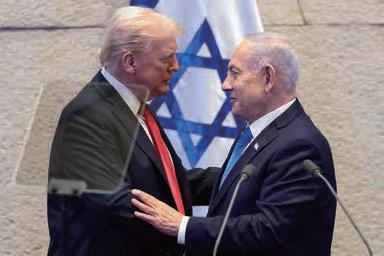 13日、エルサレムのイスラエル国会で、言葉を交わすネタニヤフ首相 (右)とトランプ米大統領