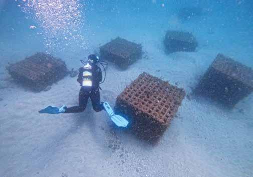 The hotels start as artificial habitats, but are rapidly covered in algae, sponges and corals.