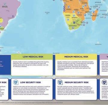 destinazioneemessoapuntostrategieanticrisi.Eallora,documentiamocisull’annoappenainiziato. Qualiareedelmondosarannopiù critiche?Ediqualiinsidiebisogneràtenereconto?CelorivelaproprioInternationalSosconlasuaannuale RiskMap2023 :unostrumentointerattivoprogettatoper consentirealleorganizzazionidi comprenderemeglioillivellodipericolositàdiciascunPaesenelmondo.Irischisanitarisonoclassificati incinquelivelli(da“basso”a“moltoalto”),mentreperlasicurezzail