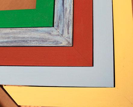 seen it here yet,” O’Sullivan said. Some of O’Sullivan’s other samples include beautifully speckled wooden frames that give a more rustic or livedin look that has been quite popular over the years. The green marbled with yellow and bits of red gives a weathered look many people look for, as does the rust-colored frame with bits of white shining through. A pastel blue, yellow, and purple frame sits in the mix, adding a bright pop in an otherwise routine color palette.