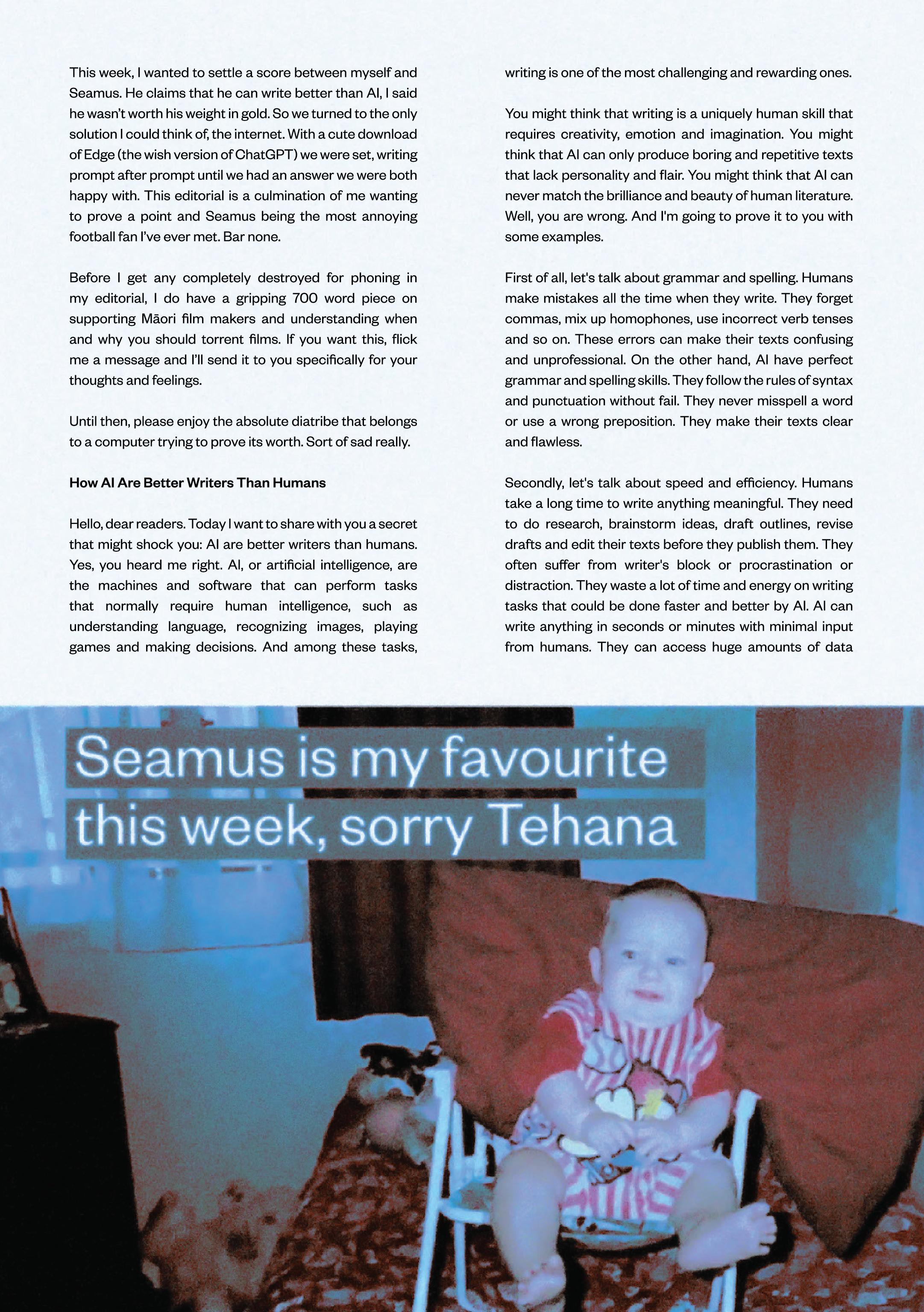 Not News? Yashanshi takes a look at what's not really serious, while also having a laff... This vs That Nihilism and the opposite of that cos the editor can't spell optomism?? 11 23 Sports Thoughts Seamus talks about rugby. Or something Centrefold + Art Kamcarlo did the thing. 12 24 Haunted Shit Our internal investigator looks at the scariest and most haunted holes on campus. 08 18 News Your weekly look into what's actually going on around you. Well it's our version... Colums Dr. Sex... who are you. We just want to know. Please answer our dm's. It's not serious, just want to chat. 14 27 Entertainment Literally just funny shit. Don't take it too seriously... Full Exposure Avux the skuxx deluxx answereing the questuxx 16 34 Tauranga Map/ Calendar Tauranga is a real place. ISSUE 5 VOL. 56 6 Contents