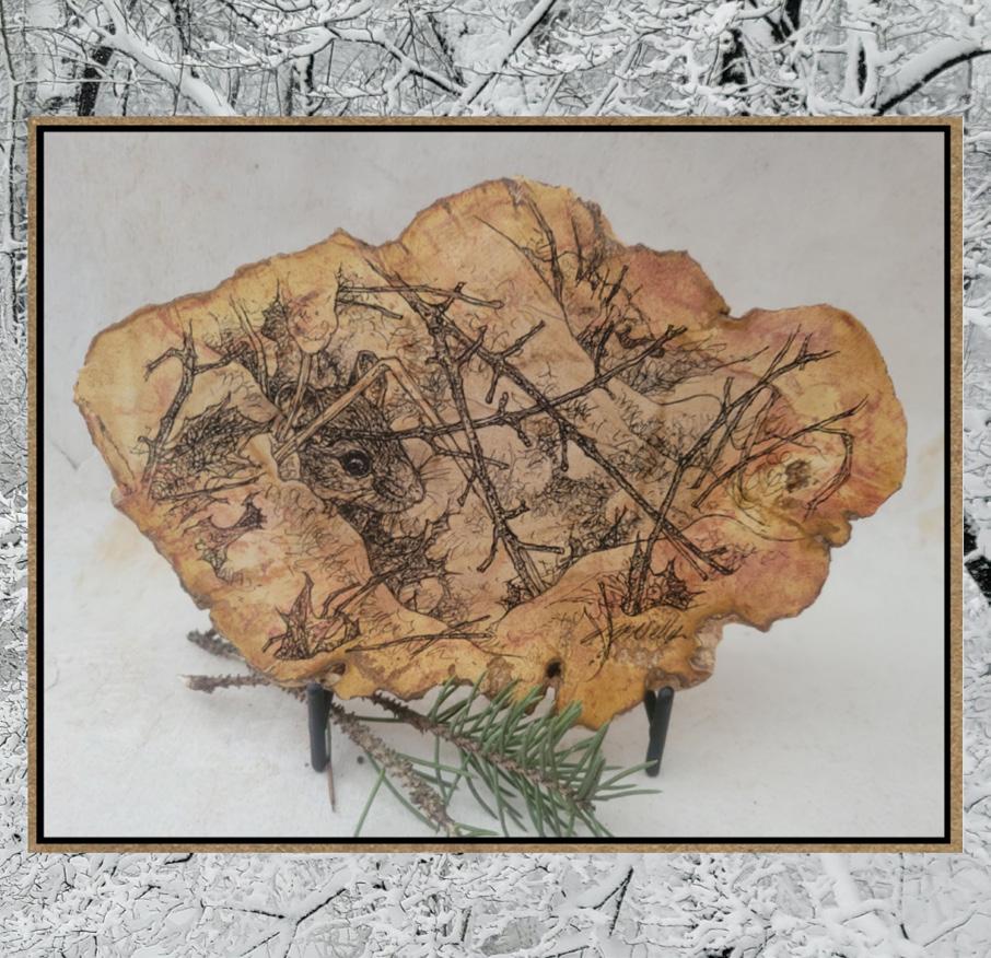 I was lucky to meet with Michael on a bright sunny February day at his studio. I have met, interviewed and featured dozens of artists for our journal in the past 10 years, all exceptionally talented and unique in their approach to their craft and diverse in their oeuvres. Michael did not disappoint. Immediately upon entering his studio I was given a whirlwind tour and synopsis of his wide-ranging artistic endeavors. They include illustrations, sculpture and a recent addition to his artistic endeavors, something called gourd art. Michael uses a wide variety of media, including pencil, oil, acrylic, polychromal pencils, and watercolor. Moreover, he uses many natural materials as his canvas, such as stone, tile, petrified wood, and, as noted, gourds.