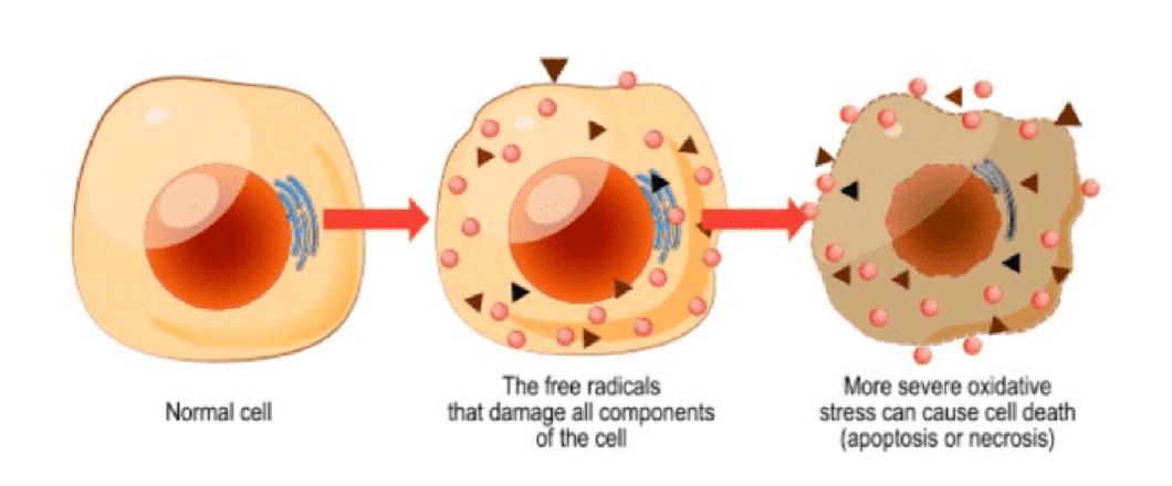 Pictured here is accumulation of free radicals and reactive oxygen species, resulting in high oxidative stress.