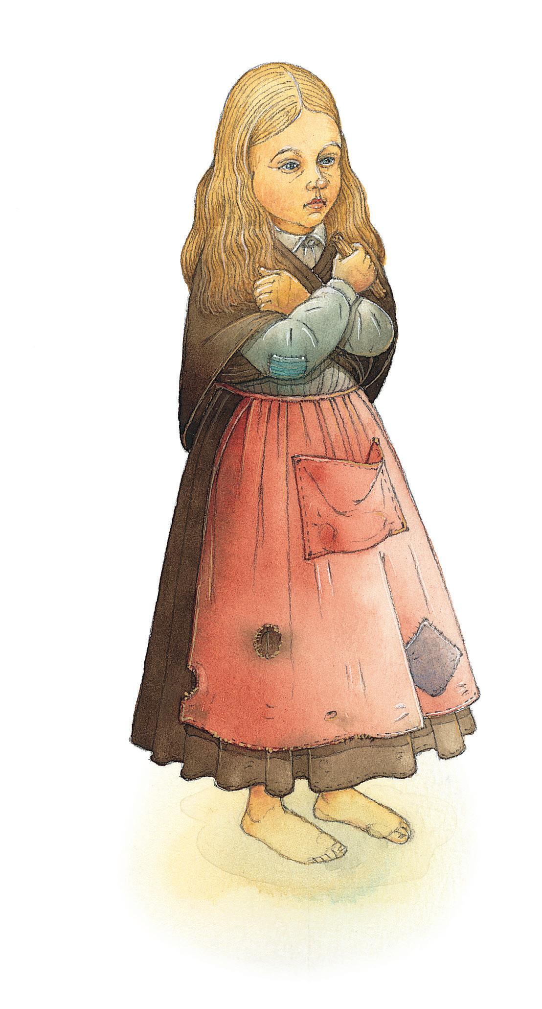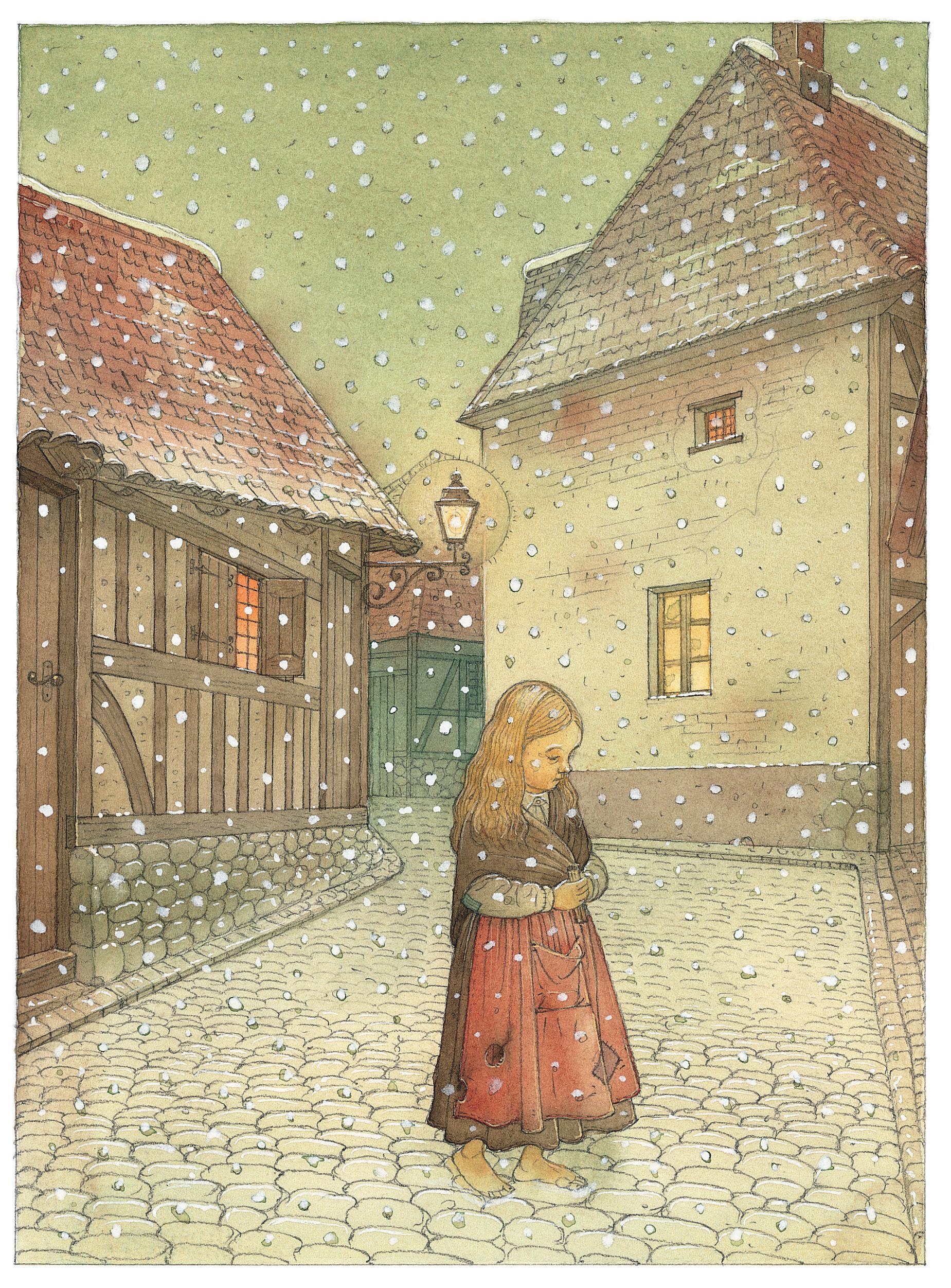 Spaudė baisus šaltis; snigo ir jau temo; buvo paskutinis metų vakaras, Naujųjų metų išvakarės. Per šitą šaltį ir tamsą gatve traukė neturtinga mergaitė – vienplaukė ir basakojė; taip, iš namų ji išties išėjo su klumpėmis, bet kas iš to!