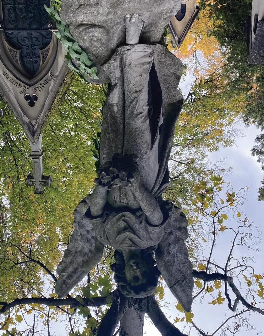 If I can get to Wilde’s stone sphinx with gigantic wings , red lipstick kisses pressed against the glass, you’ll be six graves behind and there I’ll be in the back of strangers’ photographs pruning weeds that collect around the base of our family plot, my nails scraping back the lichen steadily working its way into the crevices of the carved names, with my skirt hem cleaning out dates when the rags are too dirty to use