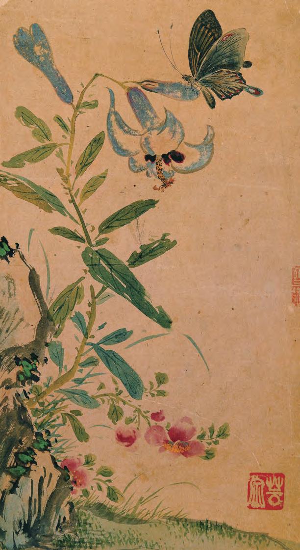 동식물과 곤충이 함께 등장하는 그림이다. 비단에 채색하는