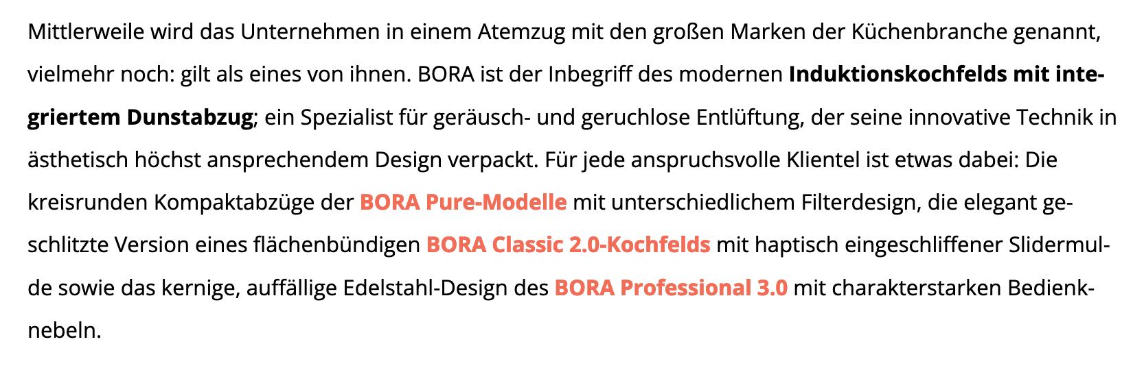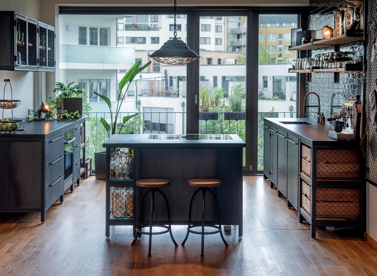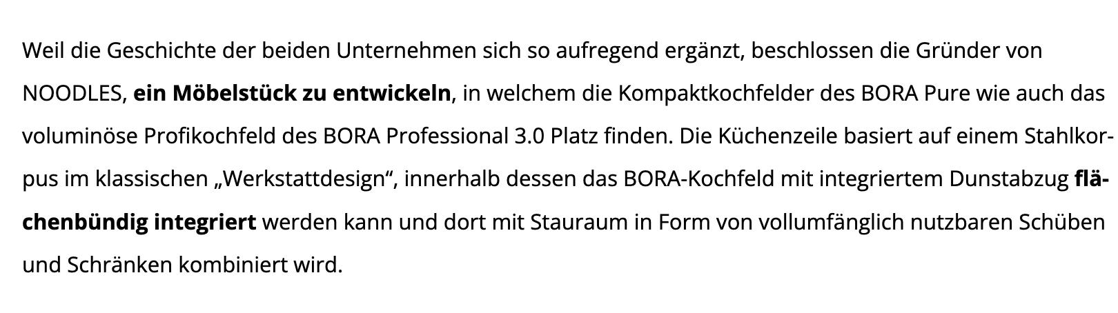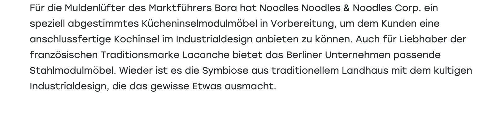 Industrial Design, der spezielle Stil (li.). Völlig freie Insel mit dem Bora Professional 3 mit Umluft. Für jeden Küchenmonteur ein Segen. Fotos: NOODLES AUTHENTIC KITCHEN | www.noodles.de