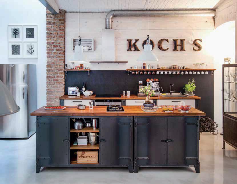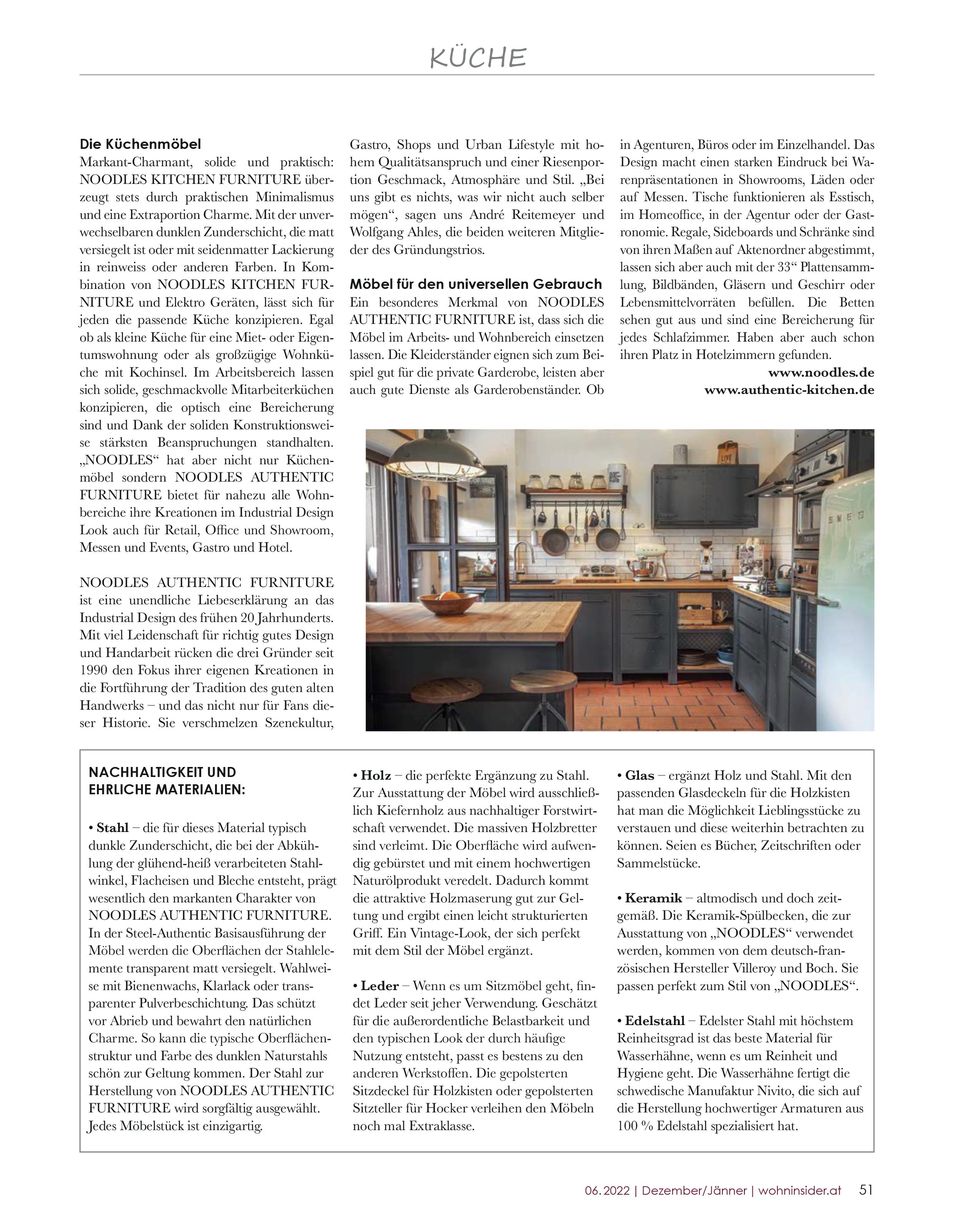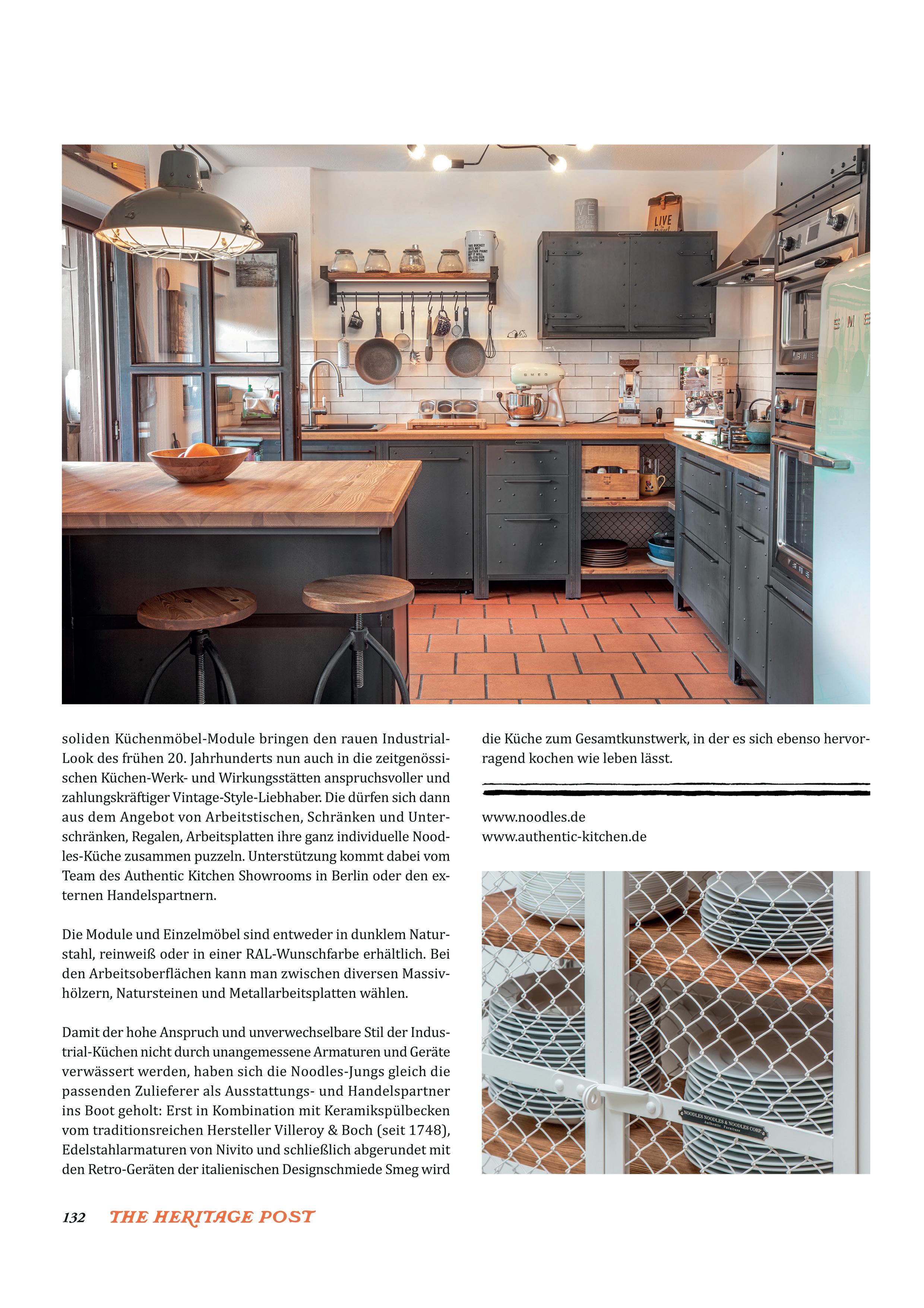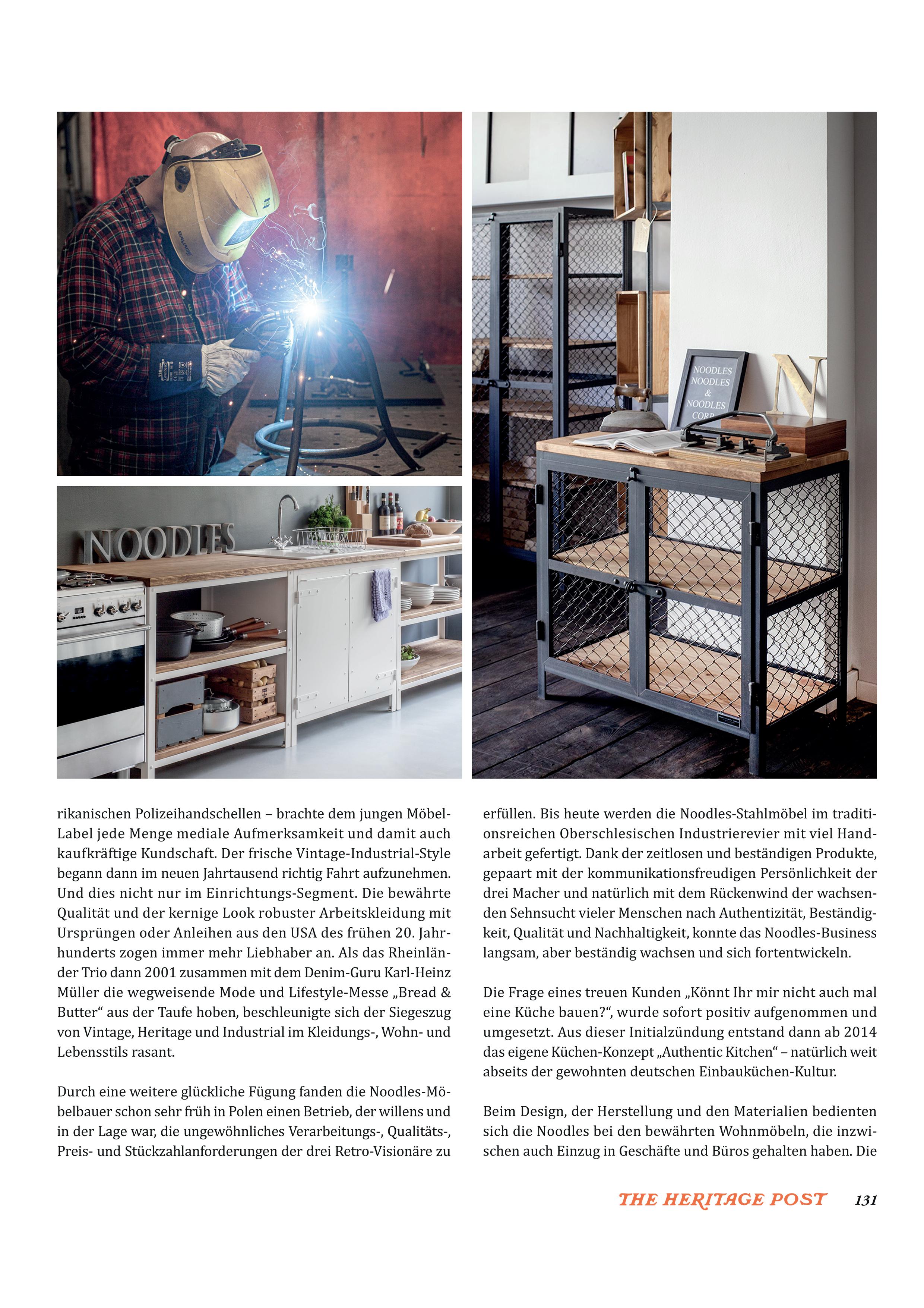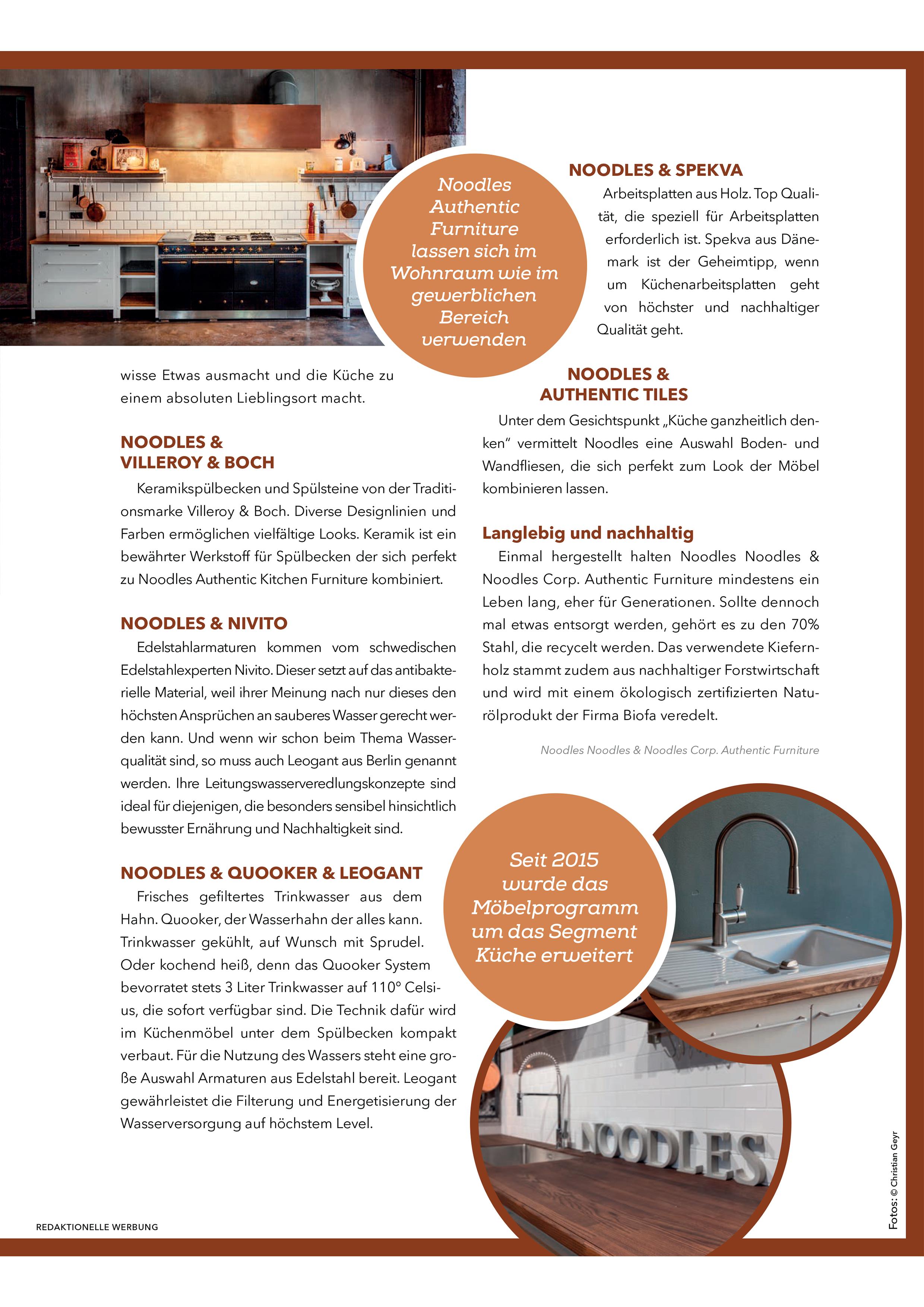 bel: Schränke, Sideboards, Regale, Hocker, Bänke, Tische – alle inspiriert vom Industriedesign des frühen 20. Jahrhunderts und traditionell aus warmgewalztem Stahl handgefertigt.» Die Geschichte der drei Freunde mit ihrer Kreativagentur nahm nun gehörig Fahrt auf. Aus der Produktion von einzelnen Möbelstücken wurde eine ganze Küche. «Wir verschmelzen Szenekultur, Gastro, Shop und Urban Lifestyle mit hohem Qualitätsanspruch und einer Riesenportion Geschmack, Atmosphäre und Stil. Bei uns gibt es nichts, was wir nicht auch selber mögen», so die drei Kreativköpfe. Die Küche ist für Noodles kein steriles Labor, sondern eine Werkstatt, die offen und lebendig zu Genuss und Geselligkeit einlädt. «Obwohl unsere Authentic Kitchen Furniture einen sehr markanten Look haben, ist es immer wieder erstaunlich, wie individuell unsere Kunden sich damit einzigartige Küchen gestalten. Jede ist anders und stets charmant», so Christian Geyr. «Als wir uns aufgemacht haben, unser Sortiment um Küchenmöbel zu erwei-