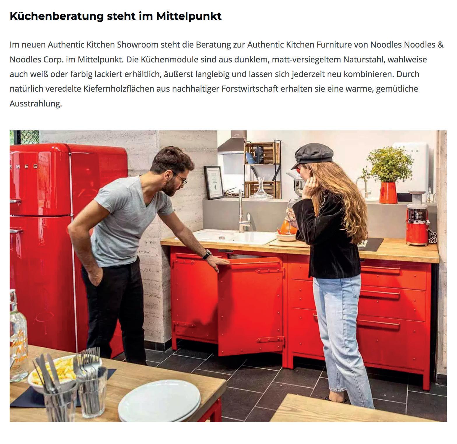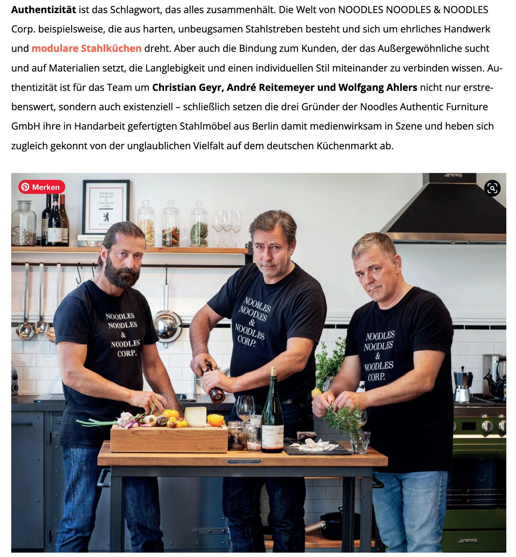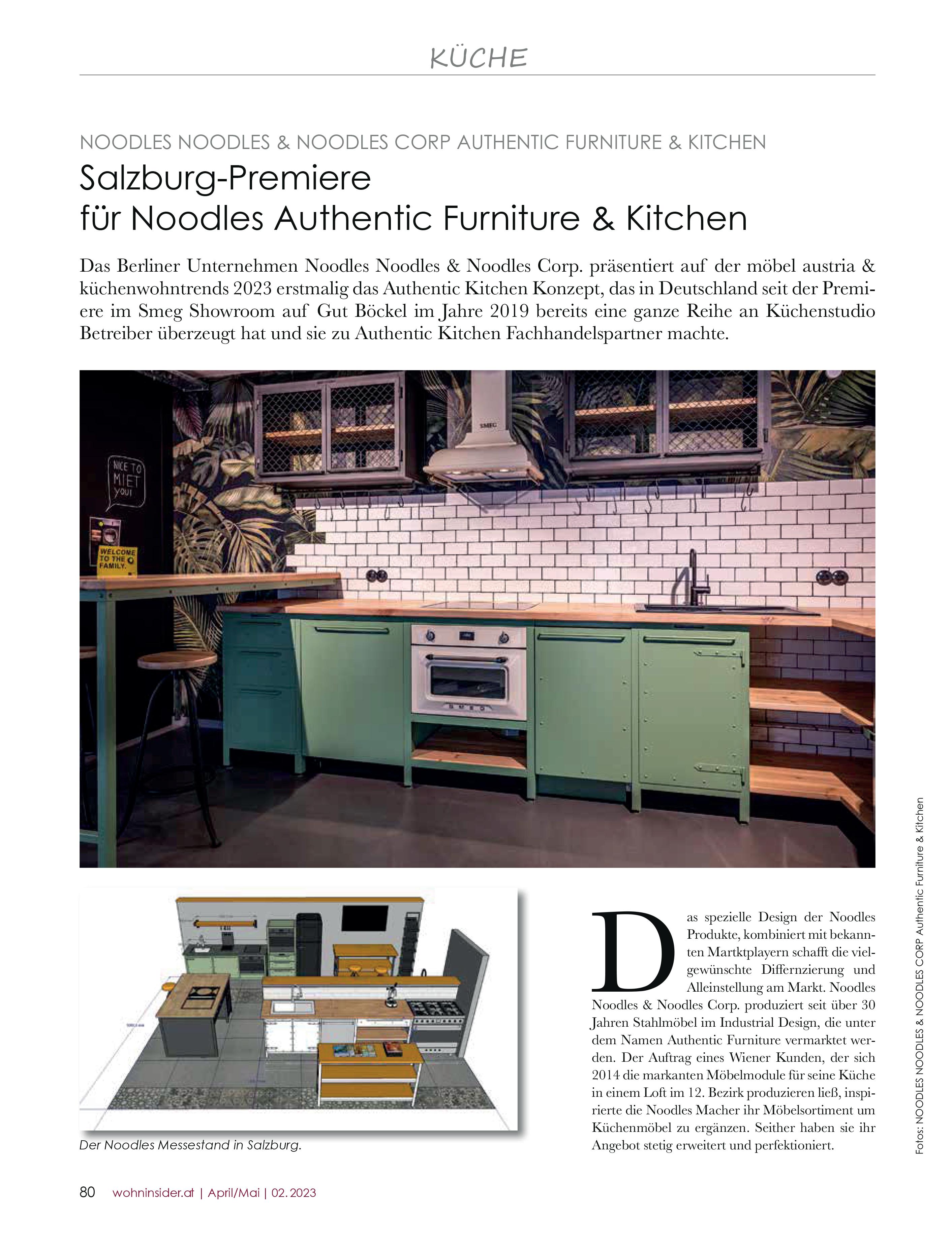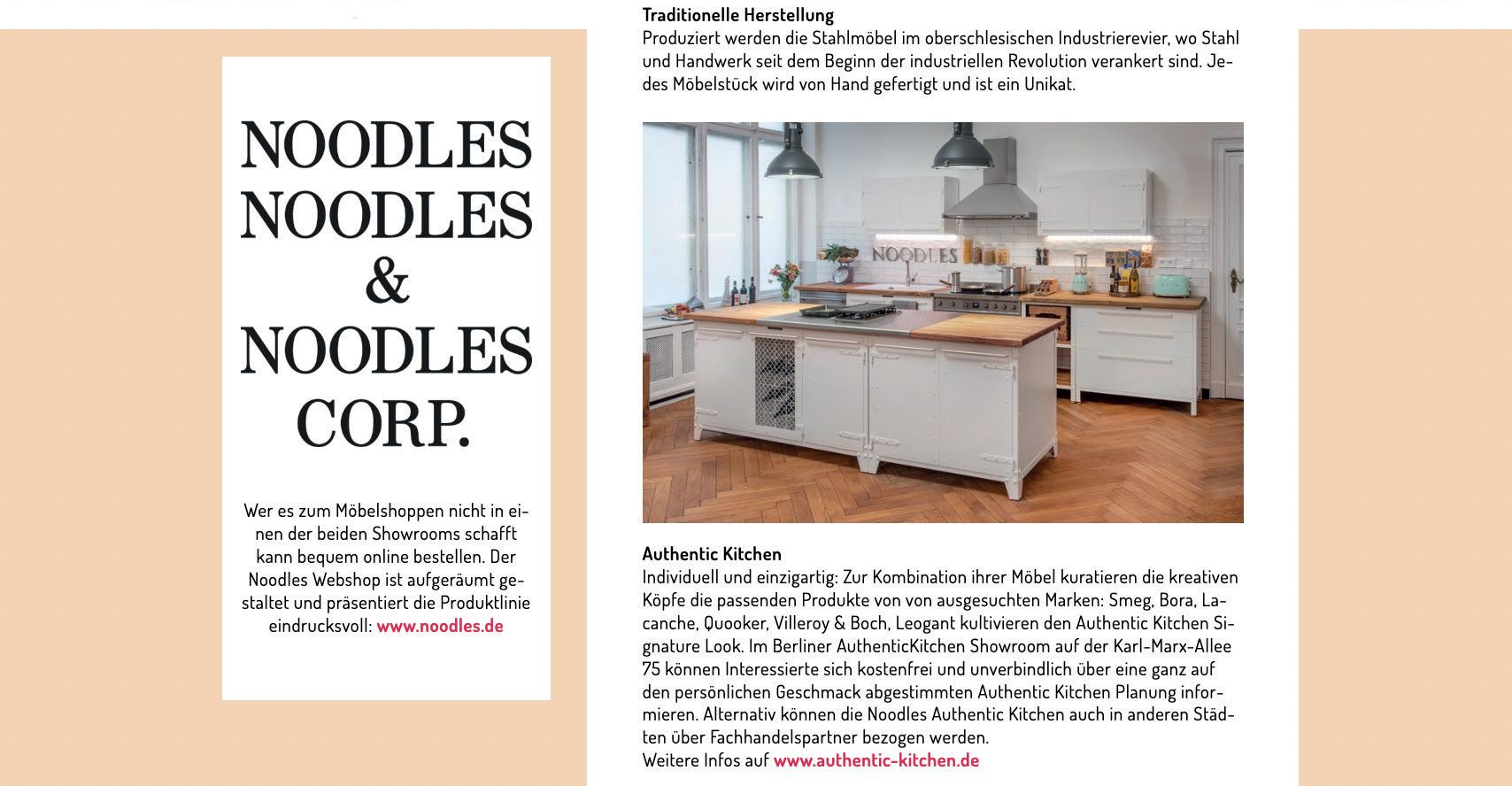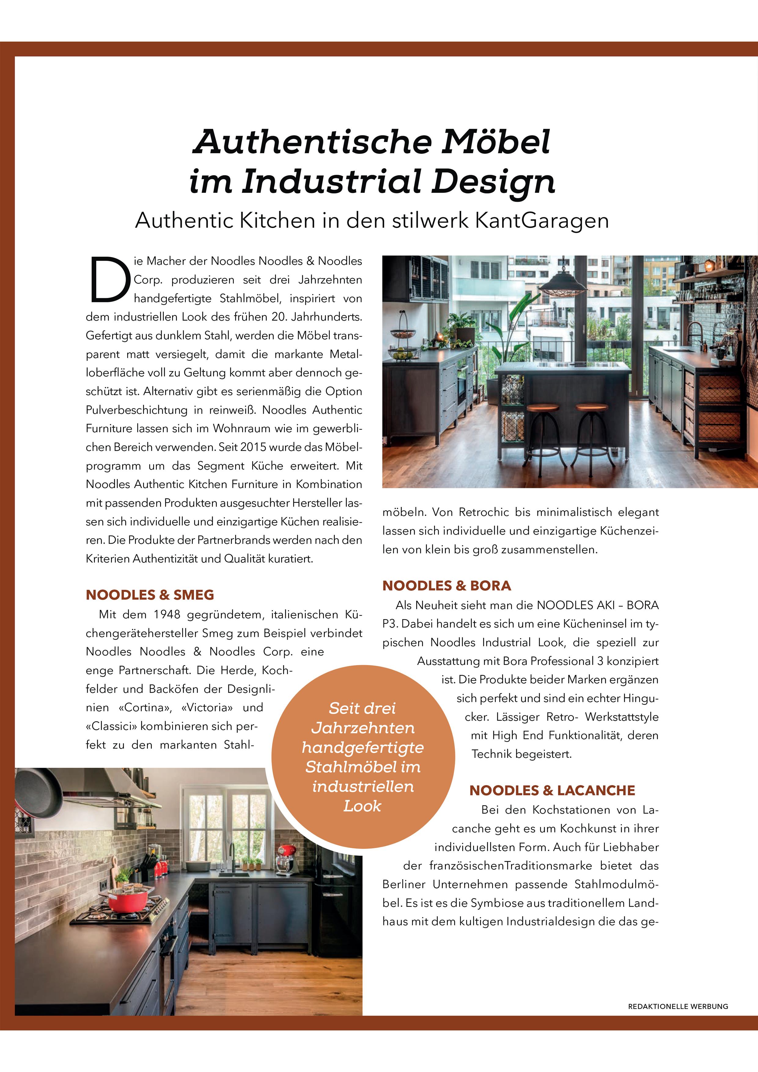 bel: Schränke, Sideboards, Regale, Hocker, Bänke, Tische – alle inspiriert vom Industriedesign des frühen 20. Jahrhunderts und traditionell aus warmgewalztem Stahl handgefertigt.» Die Geschichte der drei Freunde mit ihrer Kreativagentur nahm nun gehörig Fahrt auf. Aus der Produktion von einzelnen Möbelstücken wurde eine ganze Küche. «Wir verschmelzen Szenekultur, Gastro, Shop und Urban Lifestyle mit hohem Qualitätsanspruch und einer Riesenportion Geschmack, Atmosphäre und Stil. Bei uns gibt es nichts, was wir nicht auch selber mögen», so die drei Kreativköpfe. Die Küche ist für Noodles kein steriles Labor, sondern eine Werkstatt, die offen und lebendig zu Genuss und Geselligkeit einlädt. «Obwohl unsere Authentic Kitchen Furniture einen sehr markanten Look haben, ist es immer wieder erstaunlich, wie individuell unsere Kunden sich damit einzigartige Küchen gestalten. Jede ist anders und stets charmant», so Christian Geyr. «Als wir uns aufgemacht haben, unser Sortiment um Küchenmöbel zu erwei-