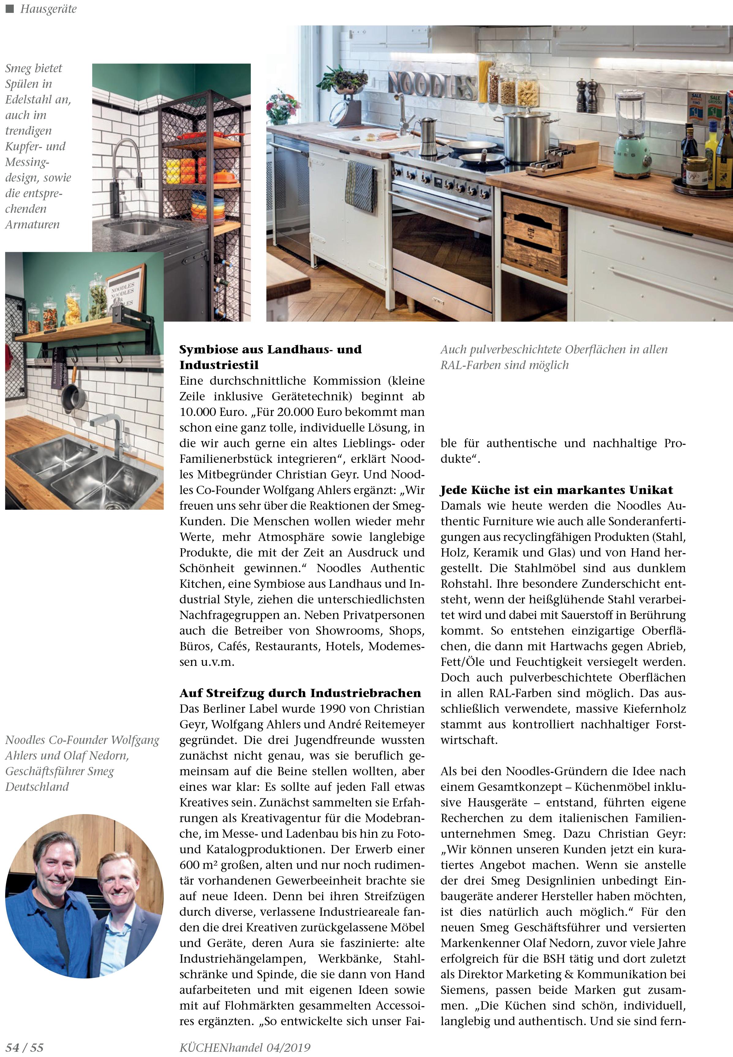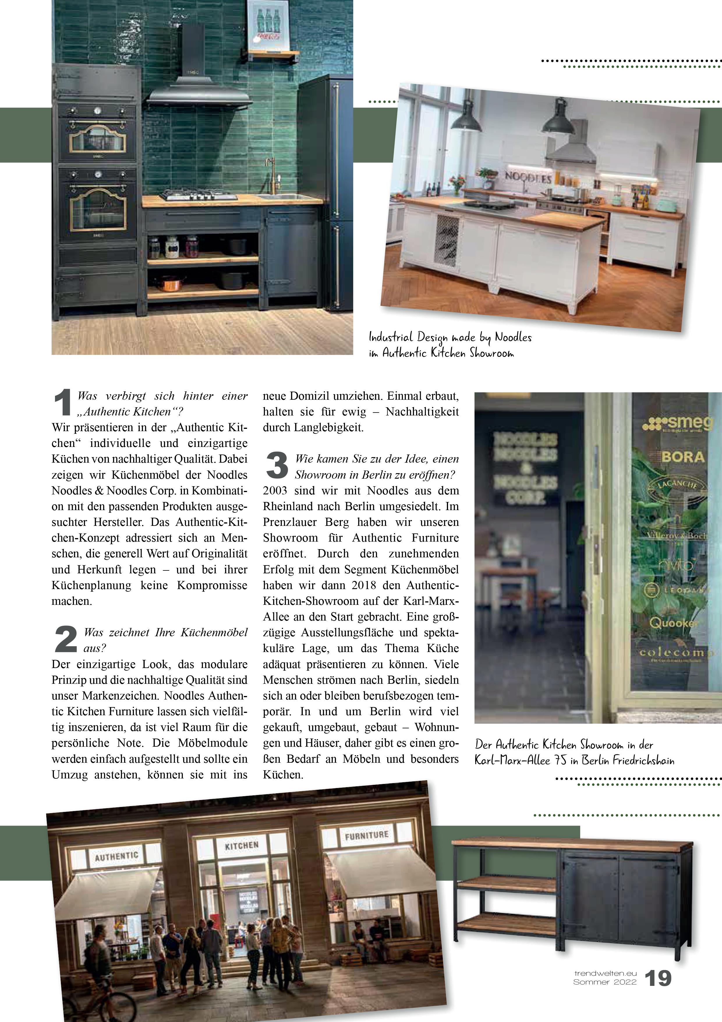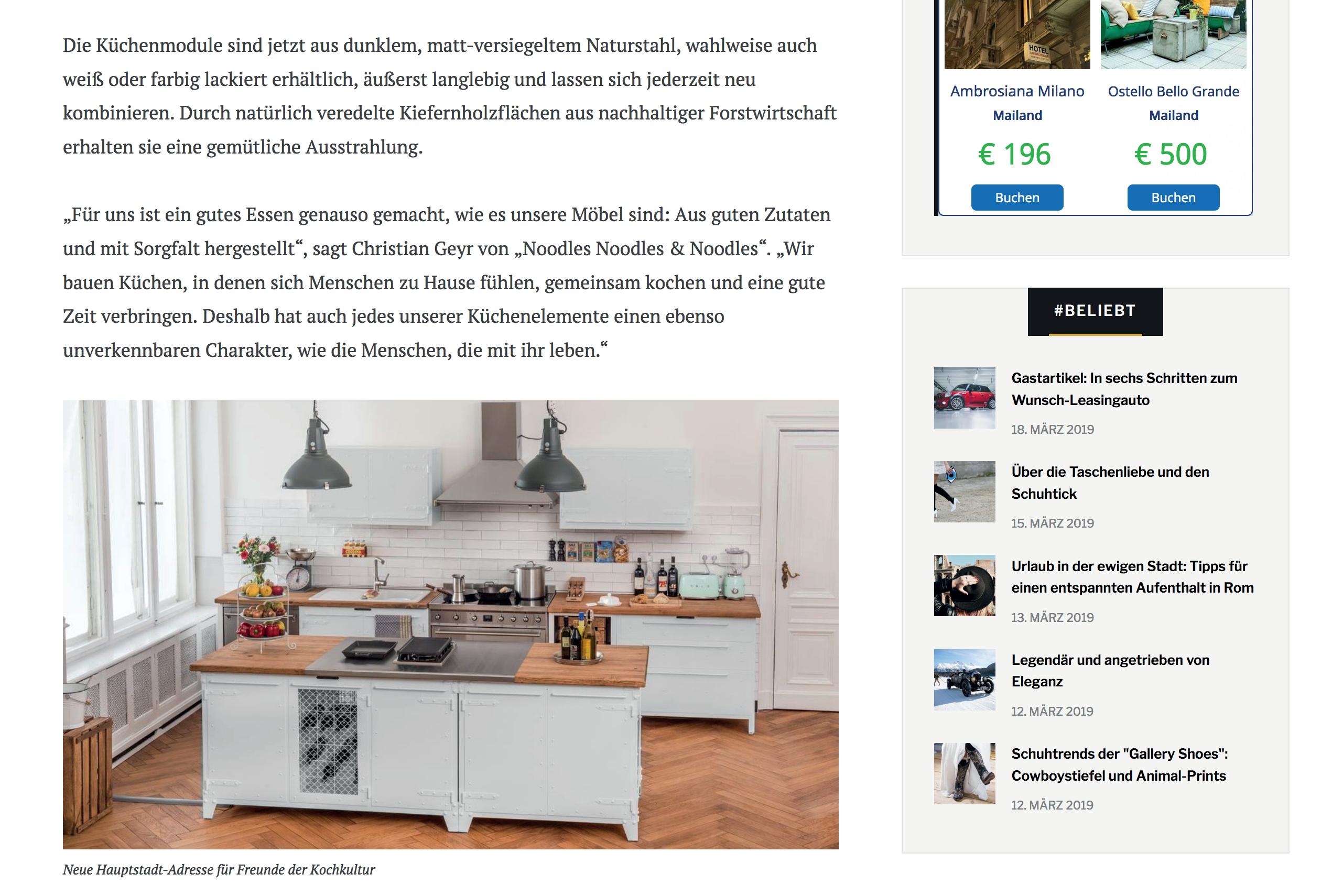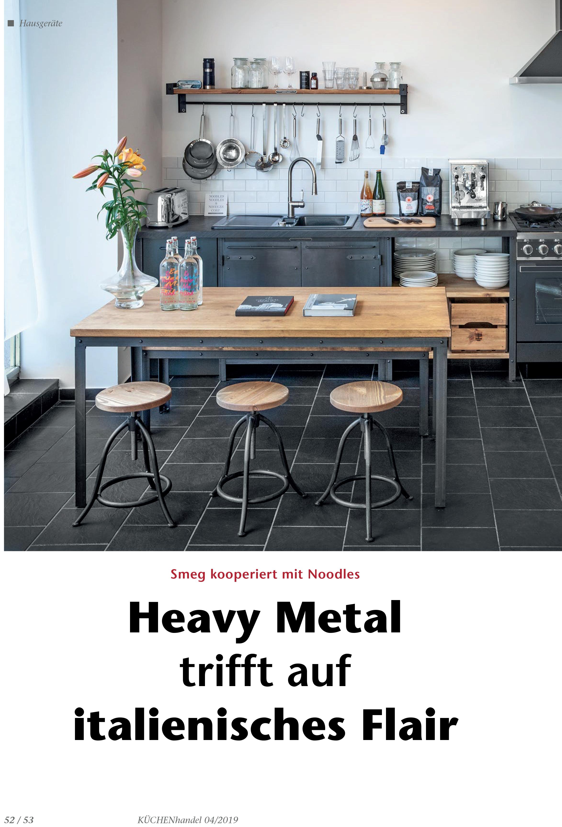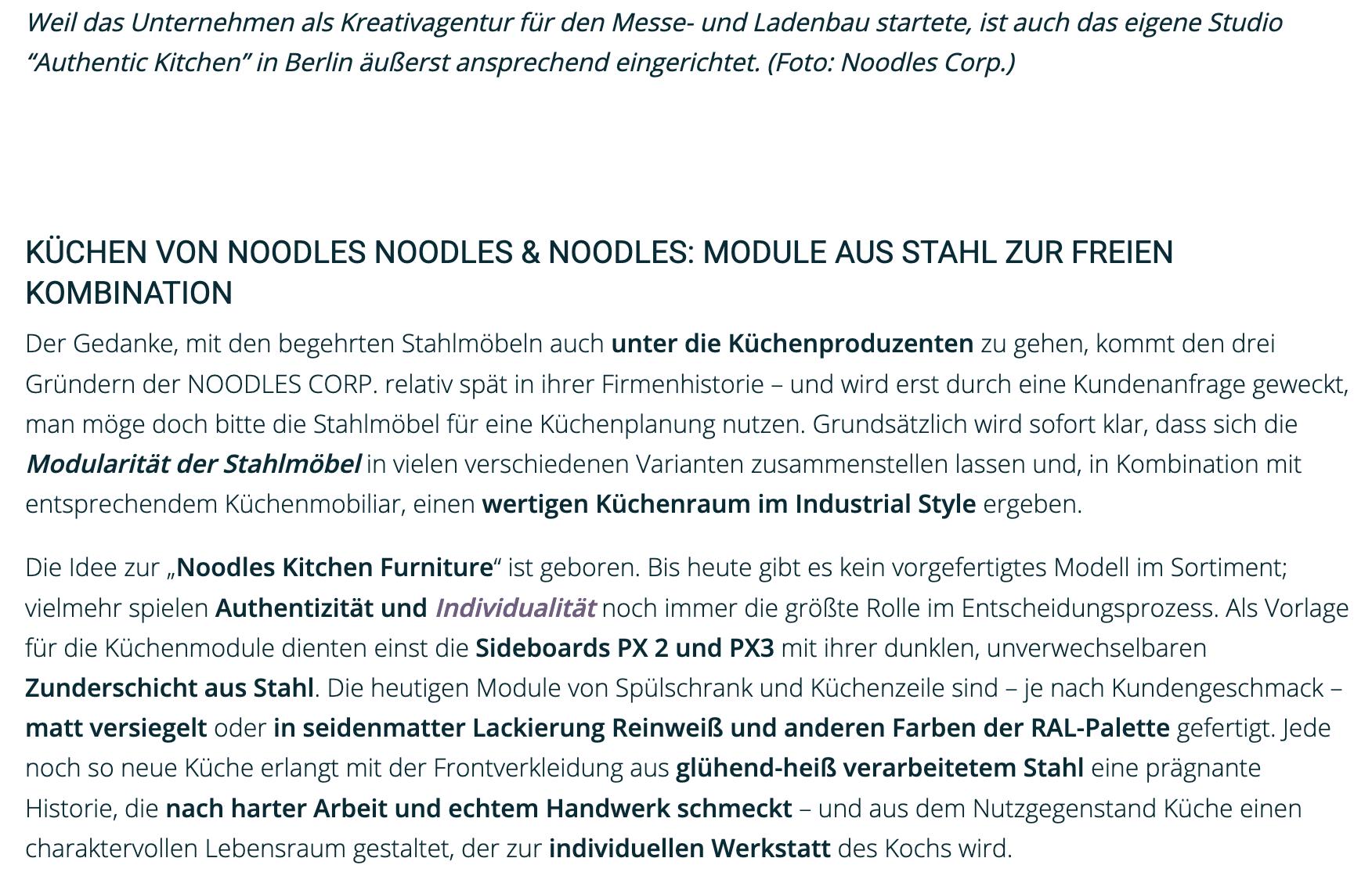 bel: Schränke, Sideboards, Regale, Hocker, Bänke, Tische – alle inspiriert vom Industriedesign des frühen 20. Jahrhunderts und traditionell aus warmgewalztem Stahl handgefertigt.» Die Geschichte der drei Freunde mit ihrer Kreativagentur nahm nun gehörig Fahrt auf. Aus der Produktion von einzelnen Möbelstücken wurde eine ganze Küche. «Wir verschmelzen Szenekultur, Gastro, Shop und Urban Lifestyle mit hohem Qualitätsanspruch und einer Riesenportion Geschmack, Atmosphäre und Stil. Bei uns gibt es nichts, was wir nicht auch selber mögen», so die drei Kreativköpfe. Die Küche ist für Noodles kein steriles Labor, sondern eine Werkstatt, die offen und lebendig zu Genuss und Geselligkeit einlädt. «Obwohl unsere Authentic Kitchen Furniture einen sehr markanten Look haben, ist es immer wieder erstaunlich, wie individuell unsere Kunden sich damit einzigartige Küchen gestalten. Jede ist anders und stets charmant», so Christian Geyr. «Als wir uns aufgemacht haben, unser Sortiment um Küchenmöbel zu erwei-