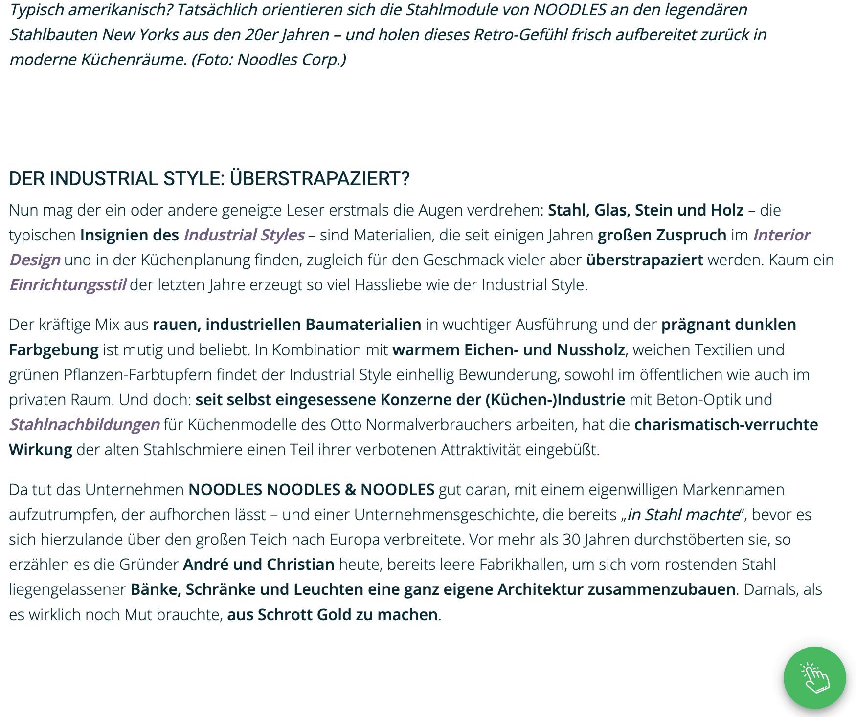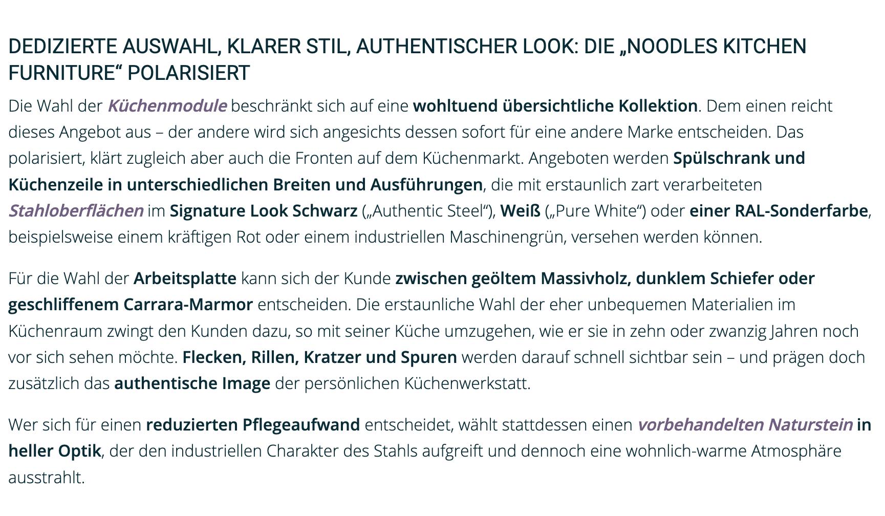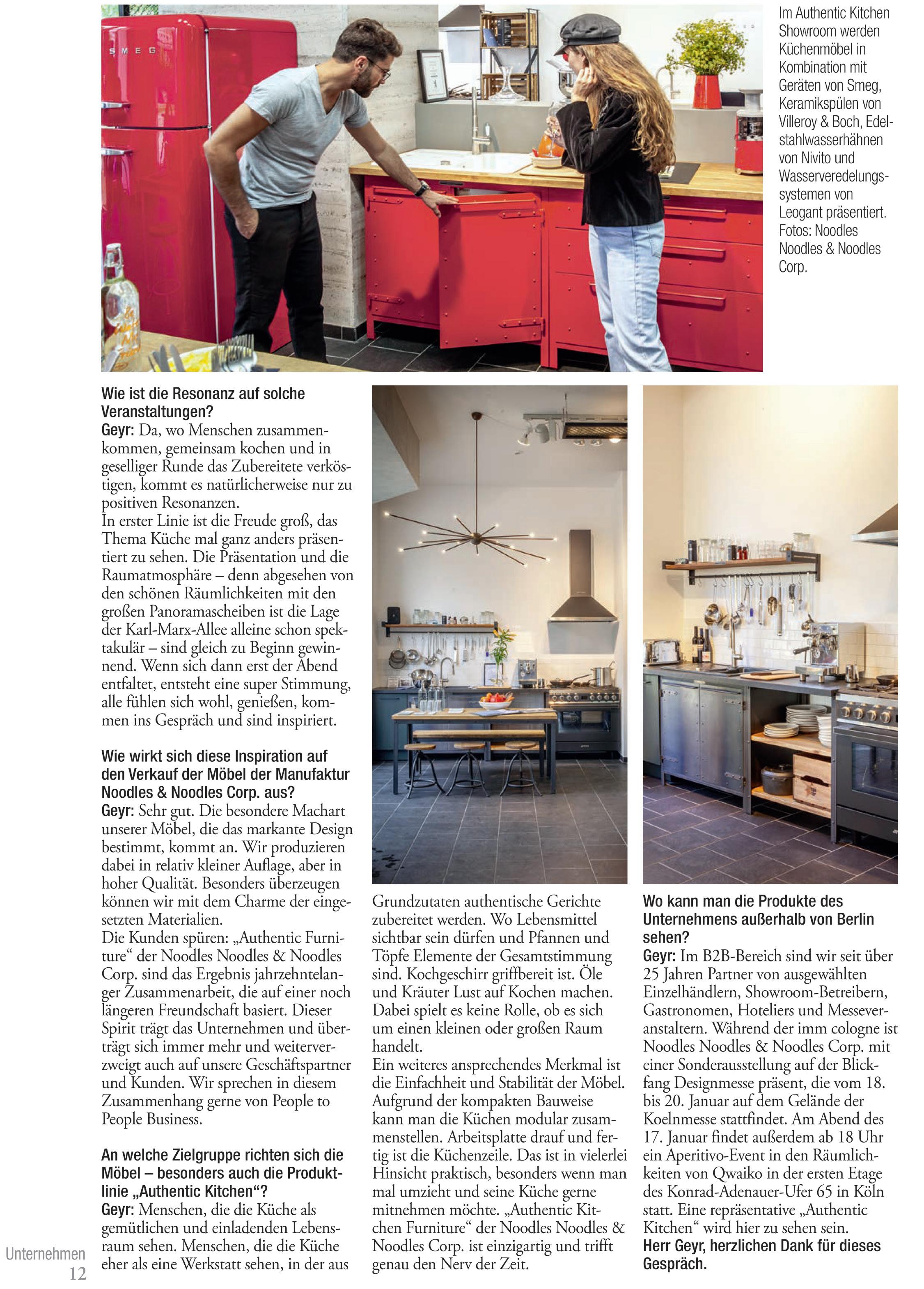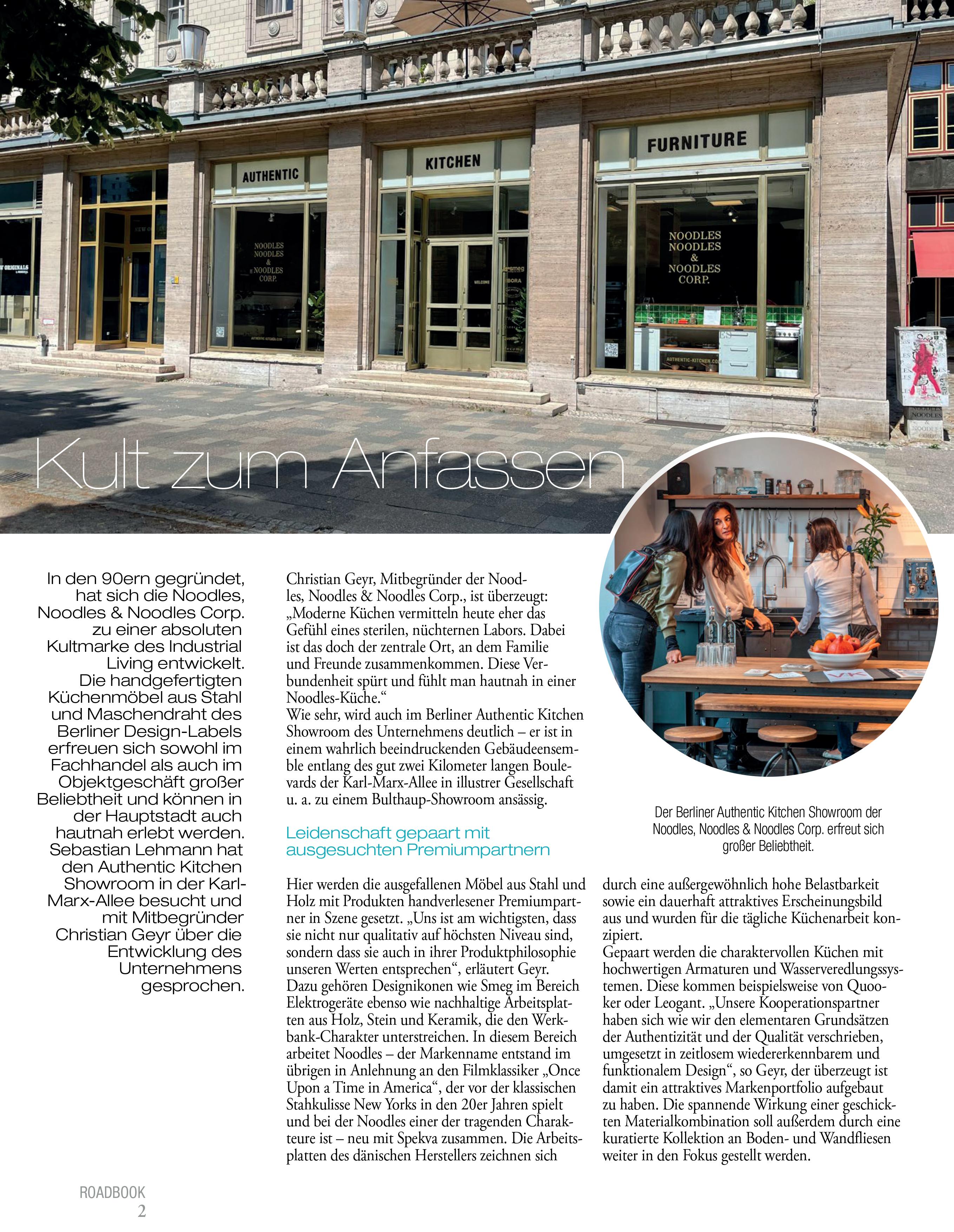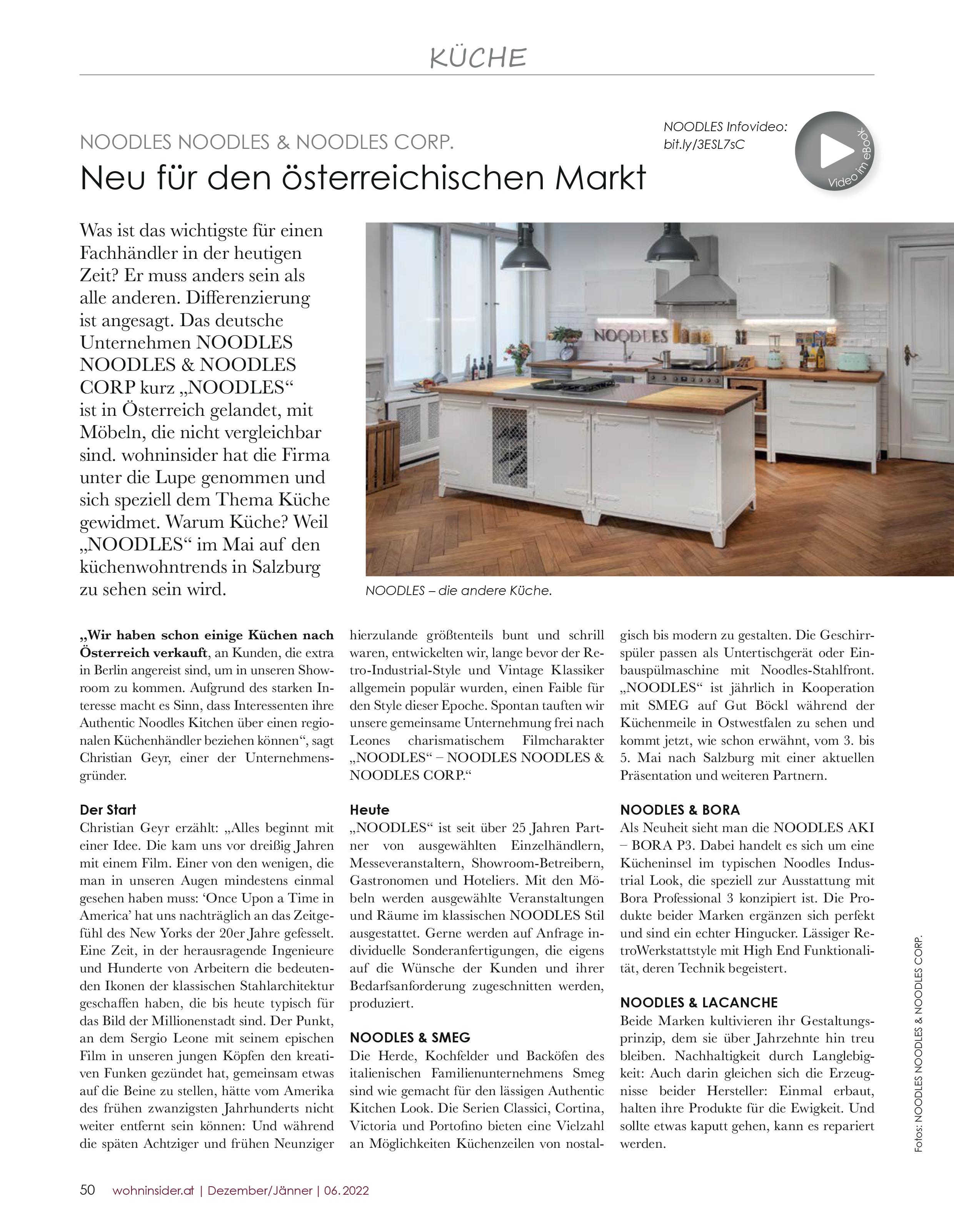 bel: Schränke, Sideboards, Regale, Hocker, Bänke, Tische – alle inspiriert vom Industriedesign des frühen 20. Jahrhunderts und traditionell aus warmgewalztem Stahl handgefertigt.» Die Geschichte der drei Freunde mit ihrer Kreativagentur nahm nun gehörig Fahrt auf. Aus der Produktion von einzelnen Möbelstücken wurde eine ganze Küche. «Wir verschmelzen Szenekultur, Gastro, Shop und Urban Lifestyle mit hohem Qualitätsanspruch und einer Riesenportion Geschmack, Atmosphäre und Stil. Bei uns gibt es nichts, was wir nicht auch selber mögen», so die drei Kreativköpfe. Die Küche ist für Noodles kein steriles Labor, sondern eine Werkstatt, die offen und lebendig zu Genuss und Geselligkeit einlädt. «Obwohl unsere Authentic Kitchen Furniture einen sehr markanten Look haben, ist es immer wieder erstaunlich, wie individuell unsere Kunden sich damit einzigartige Küchen gestalten. Jede ist anders und stets charmant», so Christian Geyr. «Als wir uns aufgemacht haben, unser Sortiment um Küchenmöbel zu erwei-