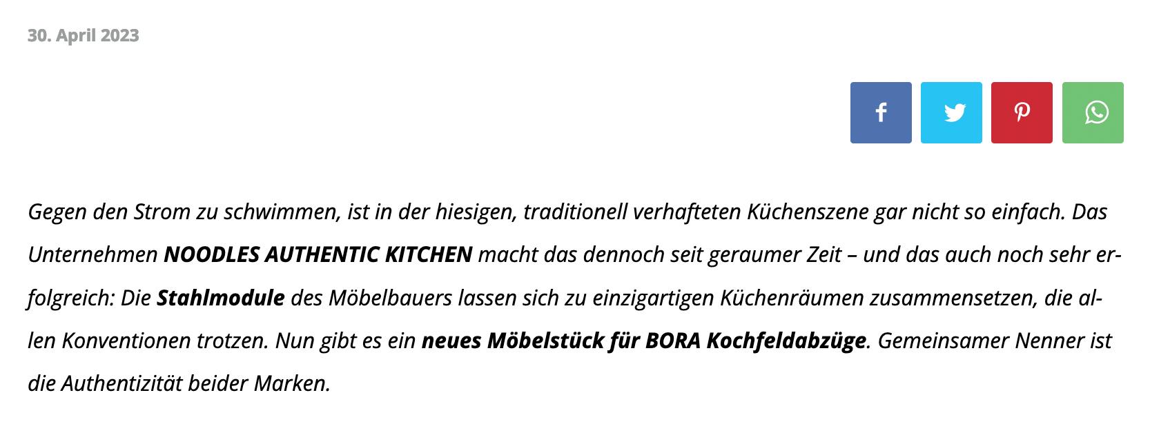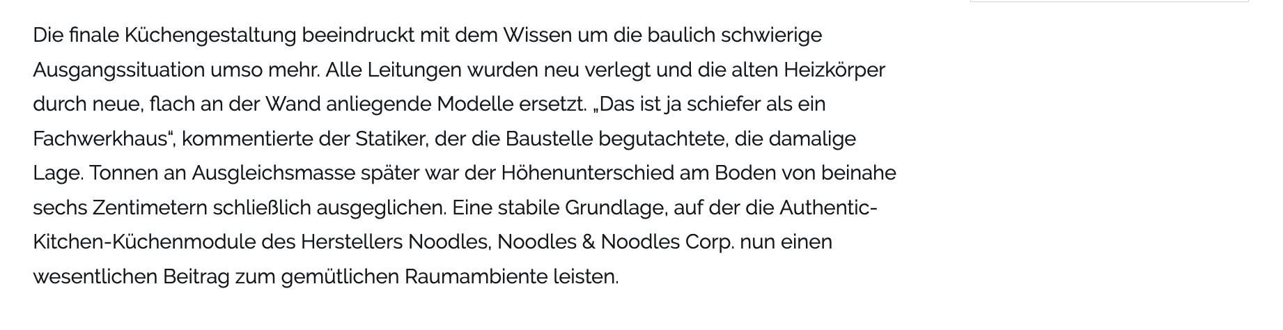 dard-Programm von Noodles verwendet werden, lediglich bei den Arbeitsplatten wurden einige Sonderanfertigungen vorgenommen. Und: Die Farbe der Holzölung wurde an das Brebau-Projekt angepasst. Hier fand man nach einigen Farbproben den richtigen Ton, was nicht zuletzt die Liebe zum Detail bei allen Beteiligten deutlich macht.