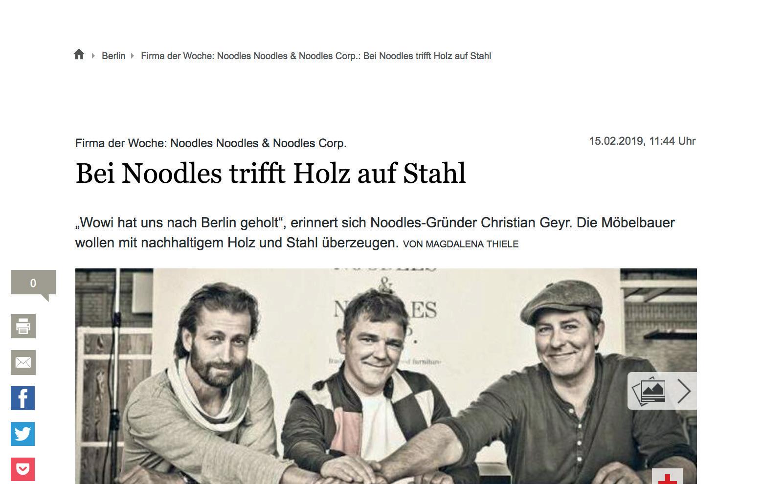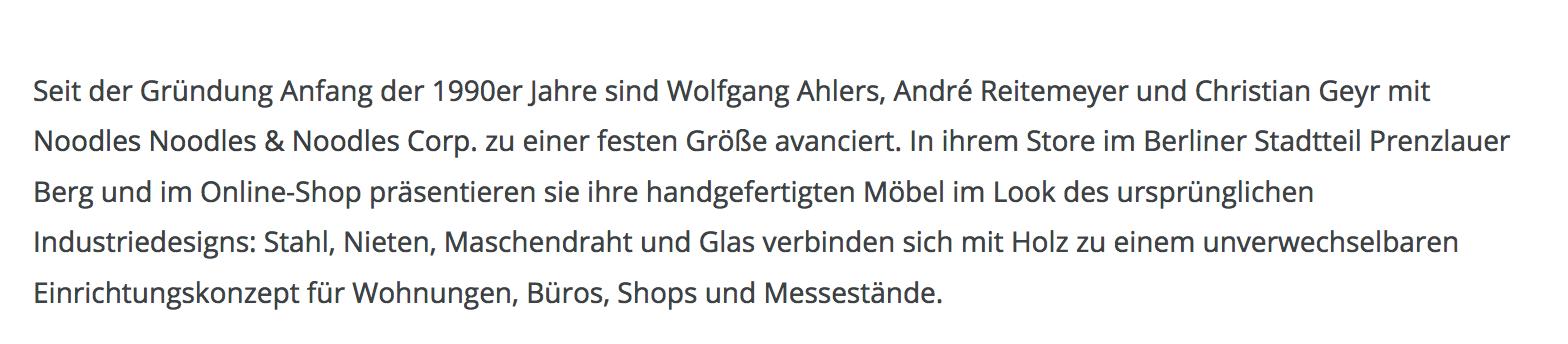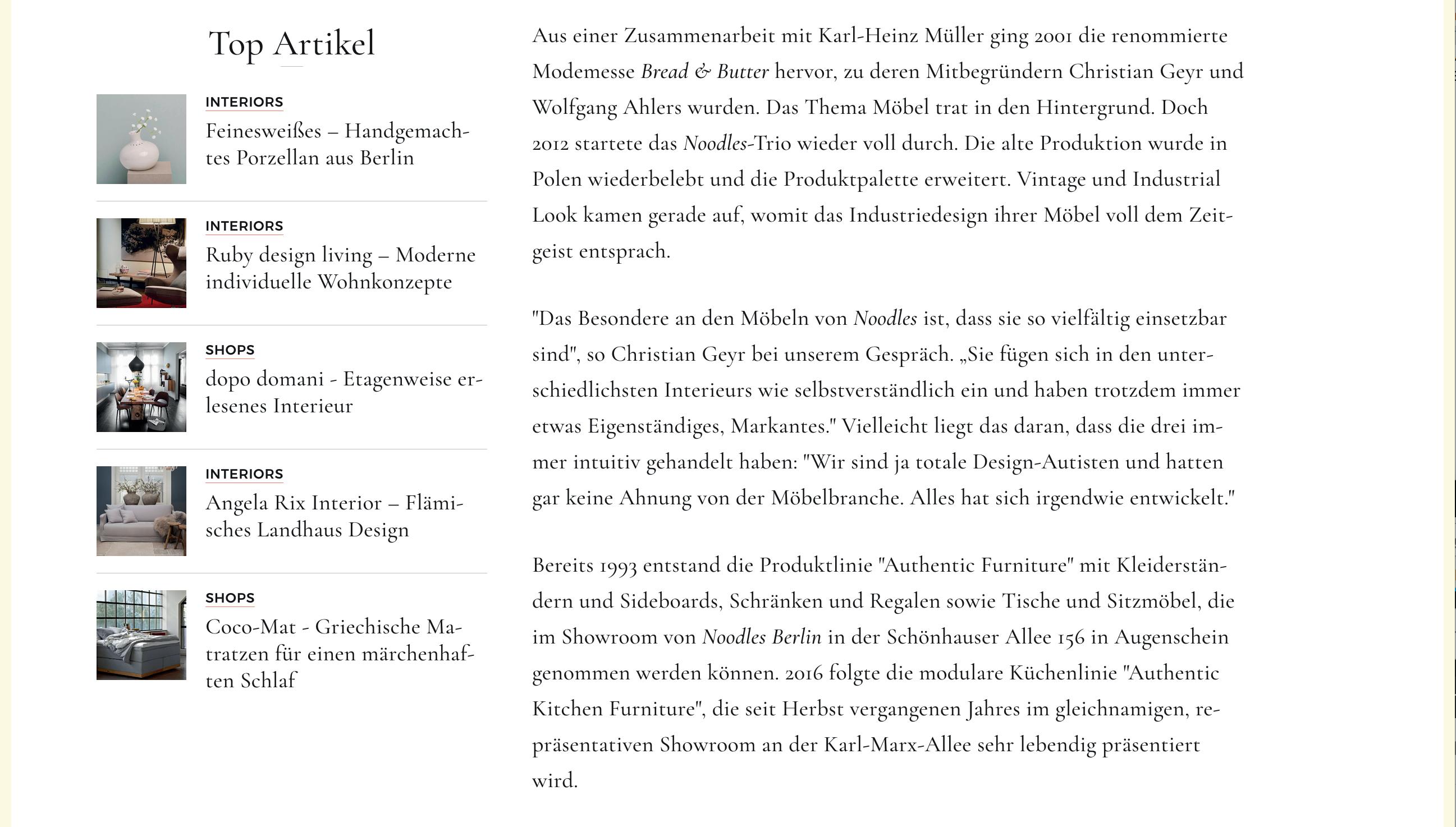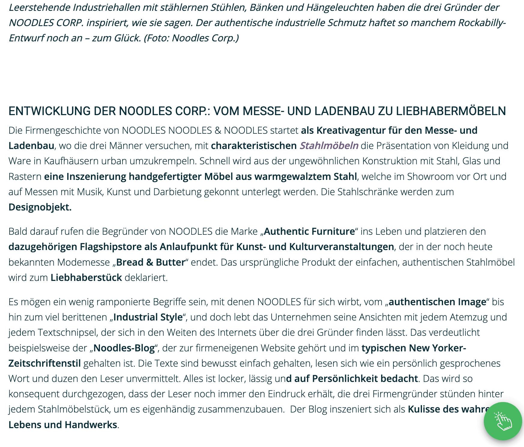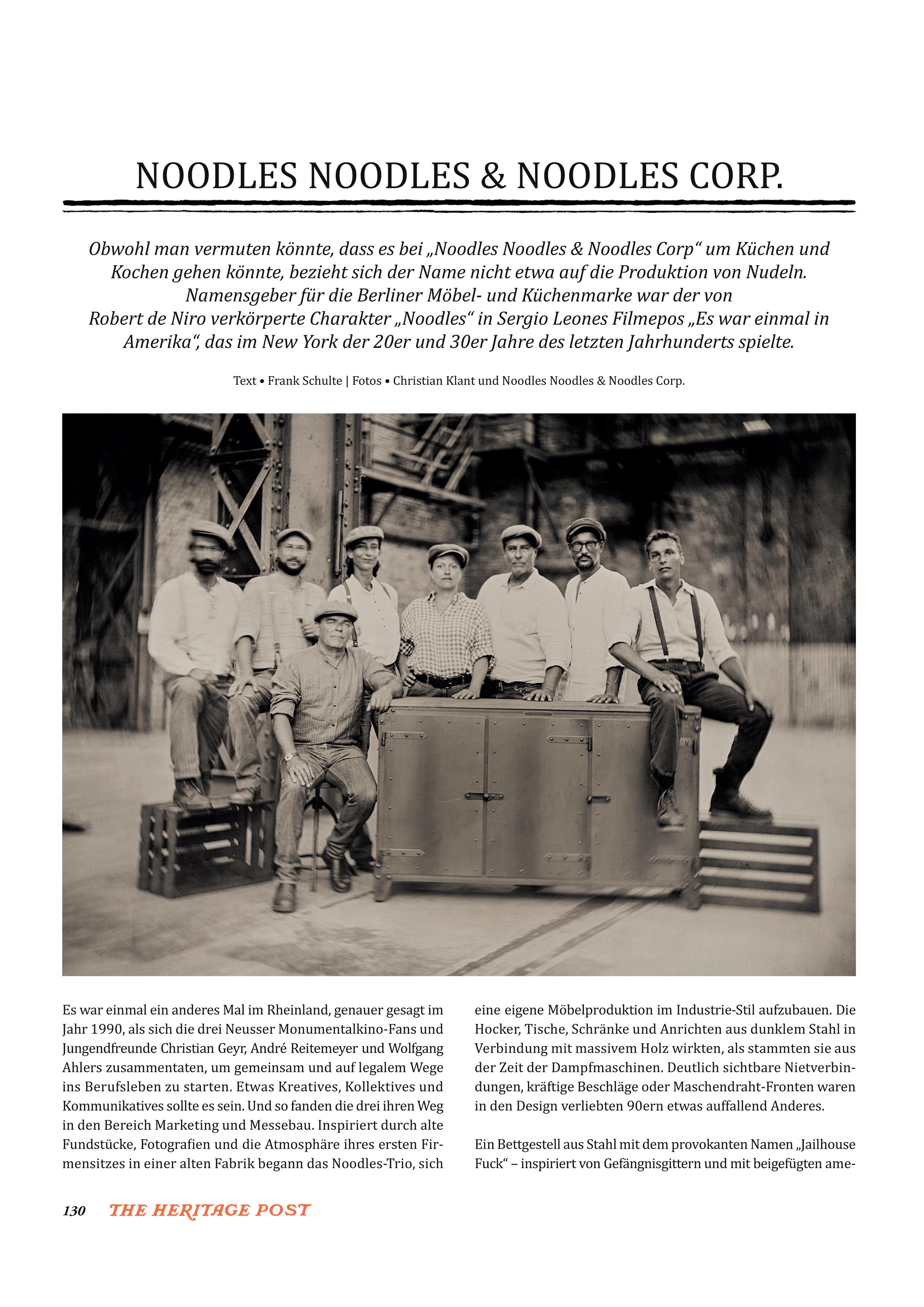 ließe: Hier geht es nicht um Pasta. Noodles, gespielt von Robert de Niro, ist der Hauptdarsteller im Filmklassiker „Es war einmal in Amerika“. Ein Film, der an das New York zu Beginn des 20. Jahrhunderts erinnert und das Gründertrio von Noodles Noodles & Noodles Corp. inspirierte. Fasziniert vom charakteristischen funktionalen Design jener Zeit fertigen André Reitemeyer, Christian Geyr und Wolfgang Ahlers nun bereits seit fast 30 Jahren Möbel im Industrial-Look. Zeitlos und nahezu unkaputtbar. Qualität ist ihr oberstes Gebot: Jedes Möbelstück ist von Hand aus robusten und recyclingfähigen Stoffen wie Stahl, Holz, Keramik und Glas gefertigt. Auffällige Details wie Nieten und Maschendraht werden mit warmen Holzflächen aus nachhaltiger Forstwirtschaft kombiniert. Die Leidenschaft der drei Freunde aus dem Düsseldorfer Raum hat aber