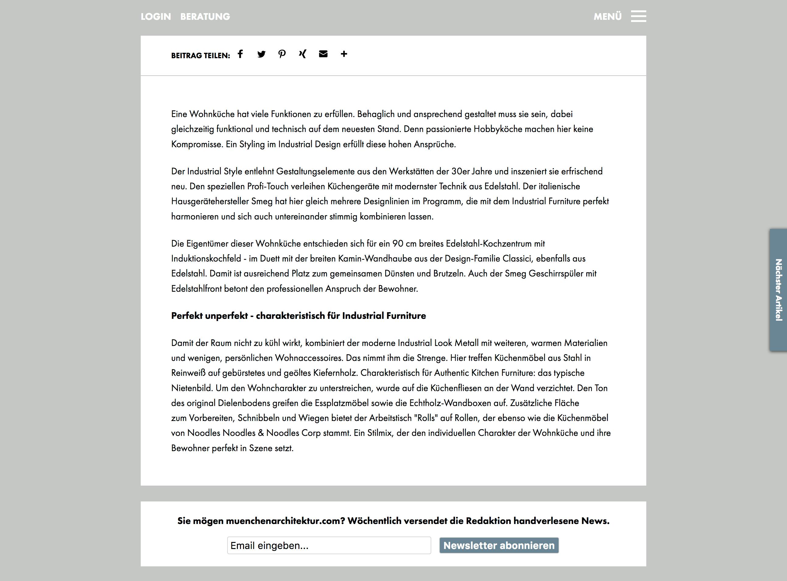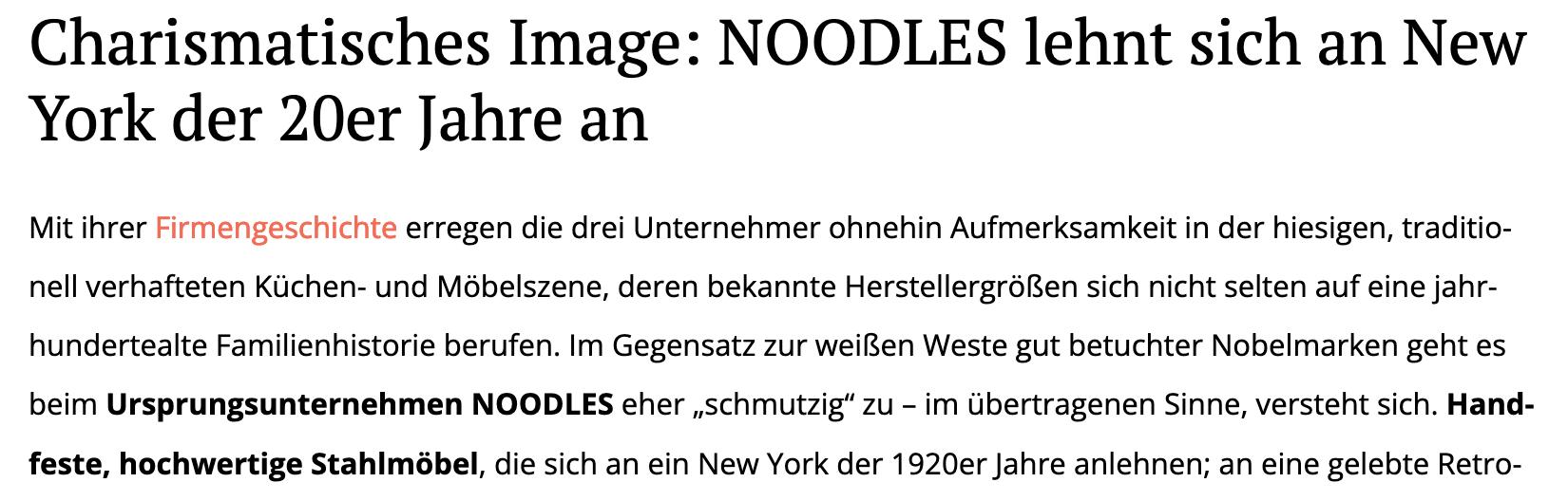 dem Holz. Der so entstehende Industrial Style erzeugt gemeinsam mit Hausgeräten der Marke Smeg einen starken Charakter, eine gewisse Coolness und eine gelassene Lebendigkeit – kurz: er verleiht den Räumen eine ganz eigene Note. Neben der Optik prägt die Noodles-Möbel weiterhin eine extrem hohe Qualität. Ganz nach dem Firmencredo „Built for Generations“ wird jedes Möbelstück per Hand gefertigt und ist damit ein Unikat. Und genau dieser hohe Qualitätsanspruch, den die drei Noodles-Geschäftsfüh rer Wolfgang Ahlers, Christian Geyr und André Reitmeyer an ihre