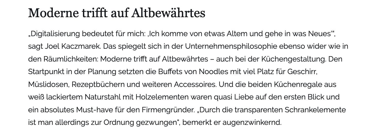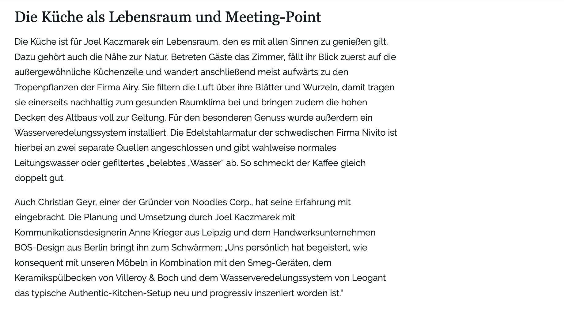 Kurz vor der Fertigstellung des Projekts zeigt sich Alexandra Wittje mehr als zufrieden: „Wir haben es geschafft, die Möbel von Noodles Teil unseres Gesamtkonzeptes werden zu lassen, und das spürt man bei jedem Blick auf die Baustelle. Ich freue mich schon heute auf weitere Projekte, die wir gemeinsam entwickeln können.“ www.noodles.de