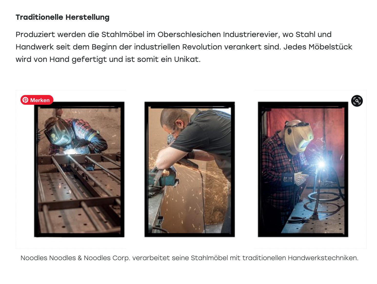 gesammelt. Begeistert von der Ästhetik begannen wir, die Fundstücke aufzuarbeiten und zu verkaufen», erzählt Christian. Angestachelt durch die enorme Nachfrage wandelte sich die Kreativagentur für die Modebranche auch in einen Handwerksbetrieb. «Wir rückten den Fokus unserer eigenen Kreationen immer mehr in die Fortführung der Tradition des guten alten Handwerks –eine einzige Liebeserklärung an das Industrial Design», so das Credo der drei. Nun ging es für Noodles auf die Suche nach einer Produktionsstätte für ihre Stahlmöbel. Fündig wurden sie in Oberschlesien. In dieser Region ist die industrielle Kultur tief verwurzelt: Kohleabbau, Stahlkochereien und Fertigungsbetriebe prägen den Standort seit dem 18. Jahrhundert. «Über unsere Freunde Locki und Jack entdeckten wir eine uralte Schlosserei mit Männern, die Eisenspäne im Blut haben. Inspiriert von dem Potenzial der Handwerker und den Produktionsmöglichkeiten der Schlosserei entwickelten wir eine eigene Kollektion authentischer Mö-