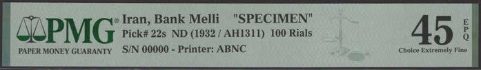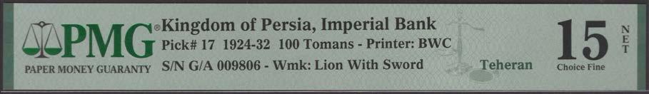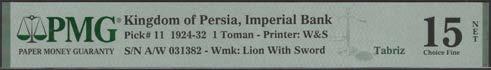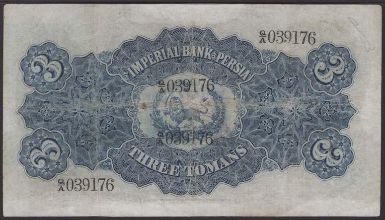 22 X IMPERIAL BANK OF PERSIA , 3 Tomans, Resht, 16 December 1911, black serial number Q/A 039176, Dalton and Wood signatures, minor repairs, in PMG holder 20, very ne, a rare branch of issue for this denomination and an attractive note