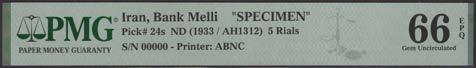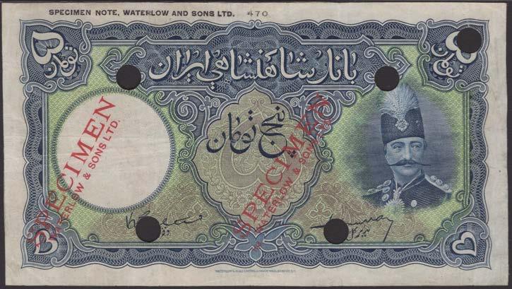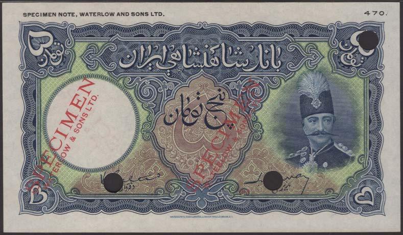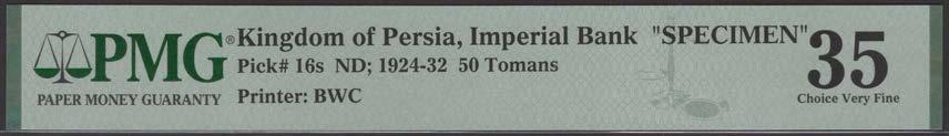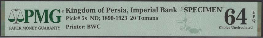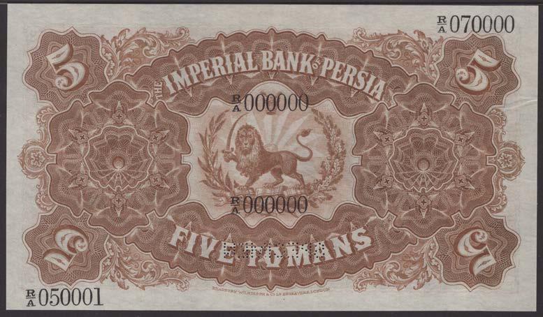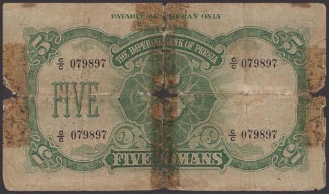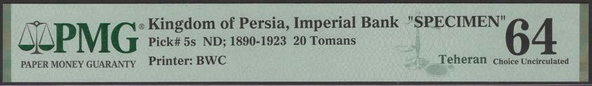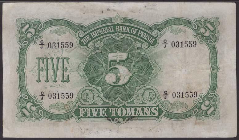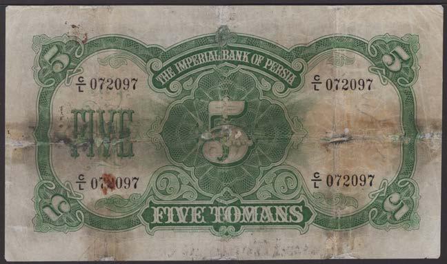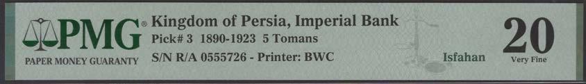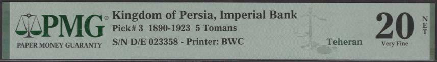 IMPERIAL BANK OF PERSIA , 5 Tomans, Teheran, 5 September 1923, black serial number R/B 083914, Walter and McMurray signatures, minor repairs, but largely original paper, in PMG holder 20, very ne and an extremely late Teheran issue released immediately prior to the replacement of these notes with the second issue, using a note intended for one of the other branches and handstamped Teheran