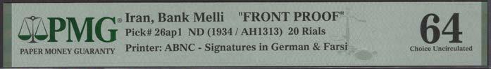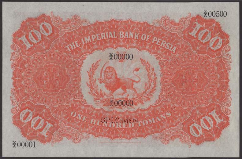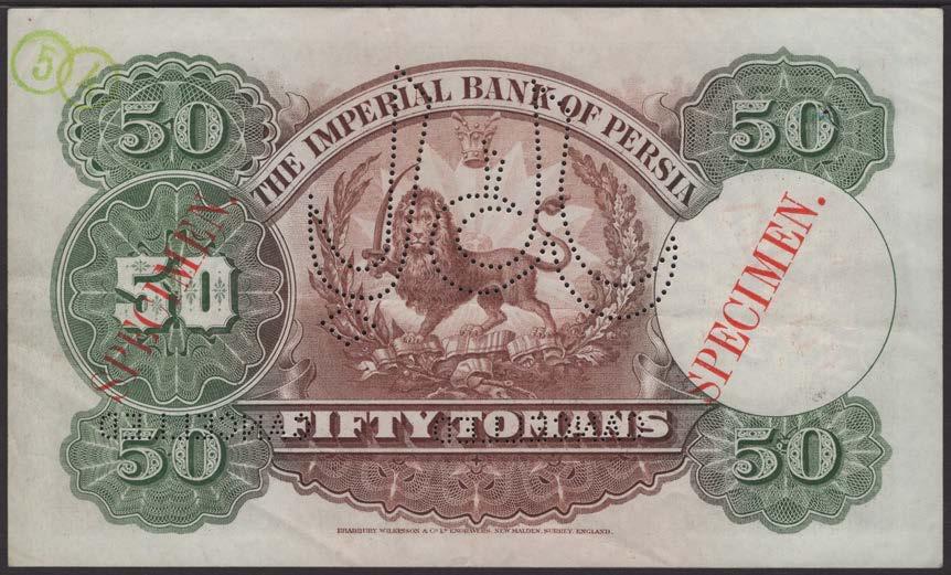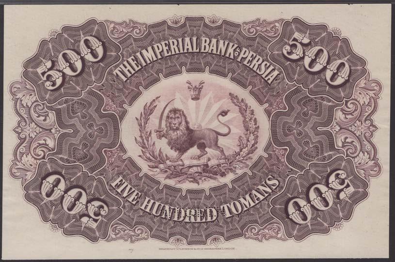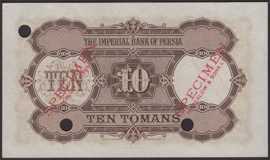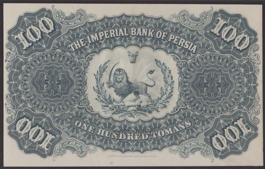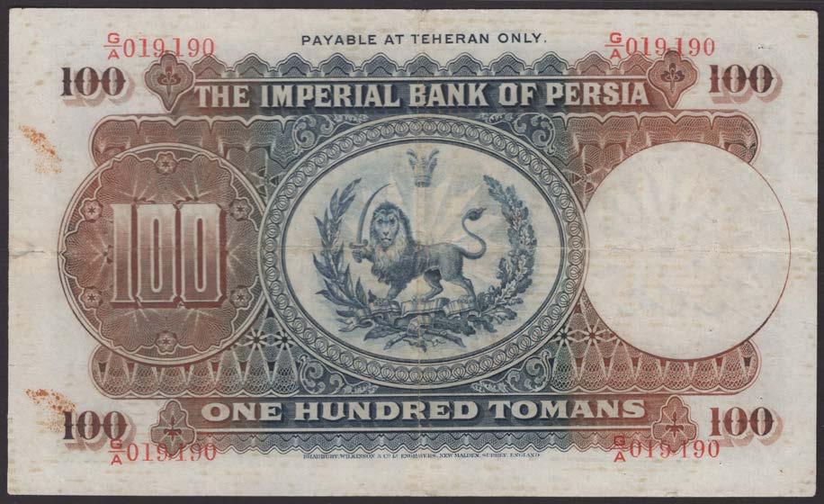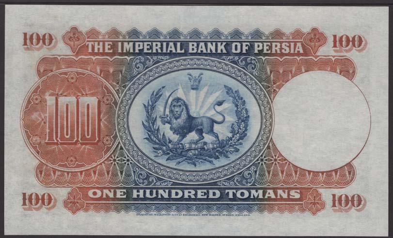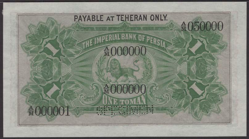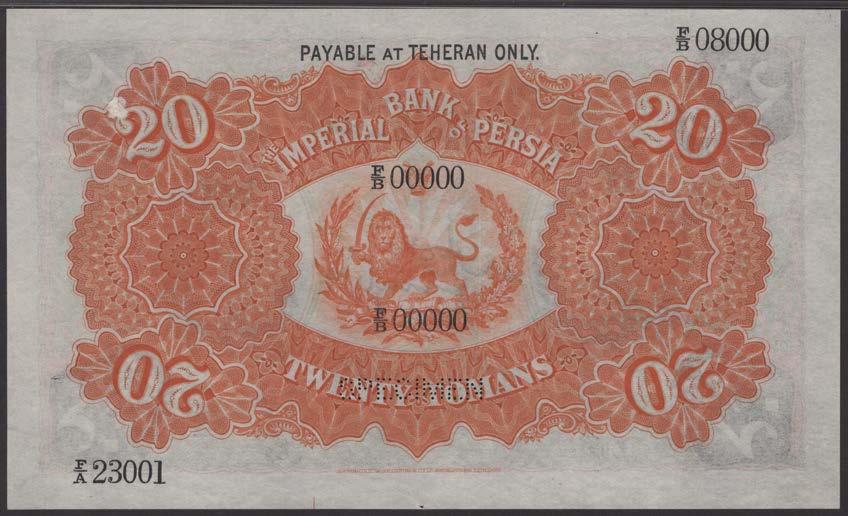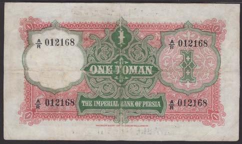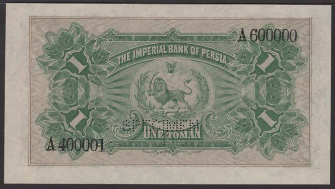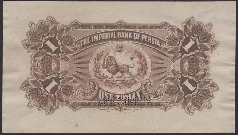 IMPERIAL BANK OF PERSIA , unissued 1 Toman, ND (1920-22), no serial number or seal, or issue location, Wilkinson and Wood signatures, annotation on obverse ‘this has not been issued & consequently is not a note’, stains, in PMG holder 20, very ne, an extremely unusual item, probably either ‘issued’ in error or stolen, but has evidently circulated regardless of its lack of serial numbers