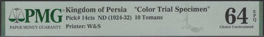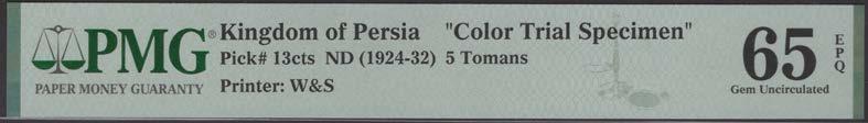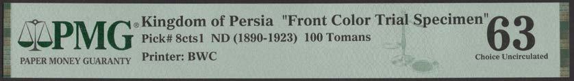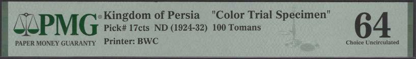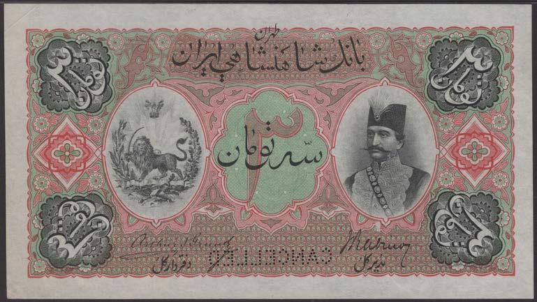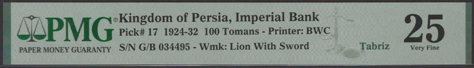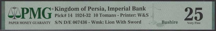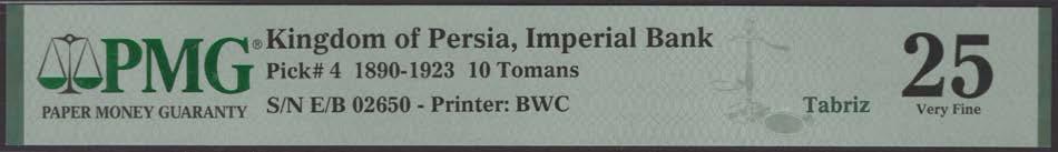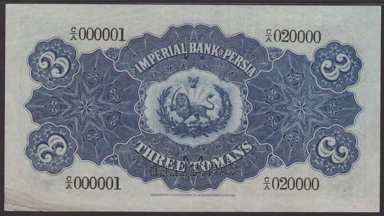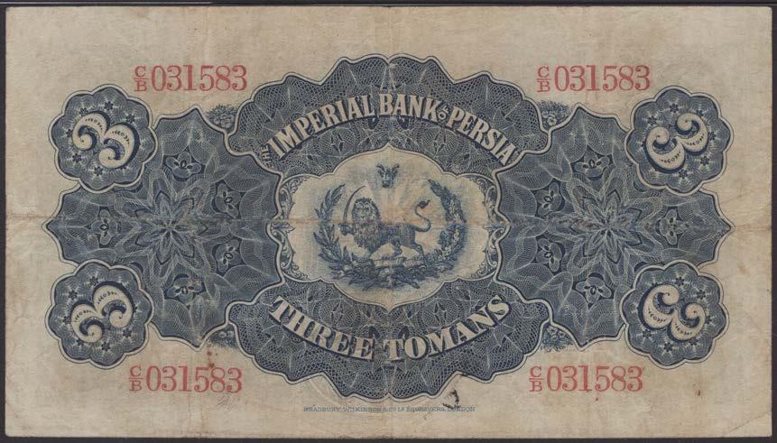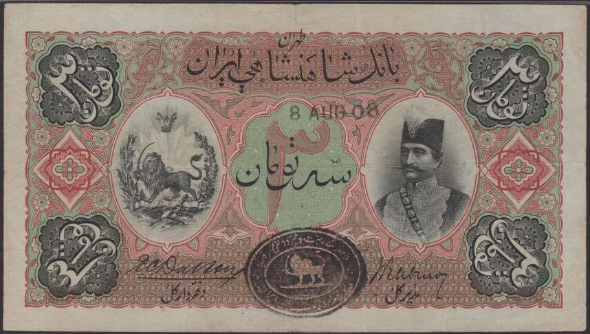 IMPERIAL BANK OF PERSIA , 3 Tomans, 8 August 1908, red serial number C/B 031583, Dalton and Rabino signatures, very attractive and problem-free, original paper, in PMG holder 25, very ne, only one example graded higher by PMG and highly unusual without a single repair, a superb note