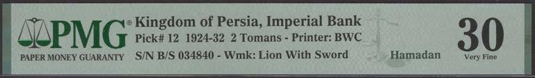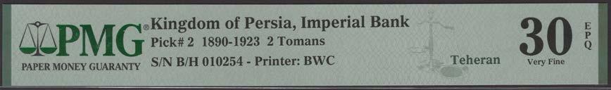 IMPERIAL BANK OF PERSIA , 2 Tomans, Teheran, 1 June 1923, black serial number B/H 010254, Walter and McMurray signatures, in PMG holder 30 EPQ, very ne, an astonishing note with spectacular paper, one of the only issued notes for the Imperial Bank of Persia ever to be granted the elusive EPQ designation by PMG, a true prize for any collector BNB B103i, Pick 2
