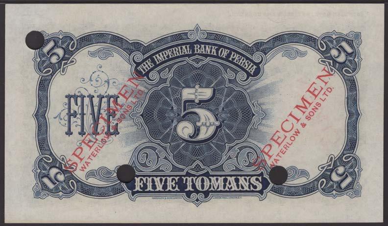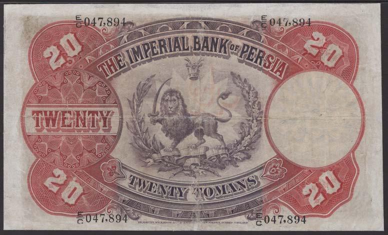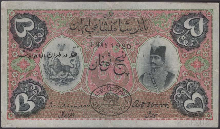 IMPERIAL BANK OF PERSIA , 5 Tomans, Teheran, 1 May 1920, black serial number D/E 023358, Wilkinson and Wood signatures, repaired, in PMG holder 20, very ne, a scarce signature combination which appears only to have been issued in Teheran BNB B105h, Pick 3 £3,000-£4,000