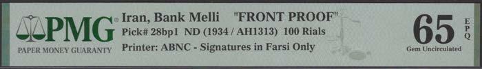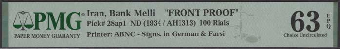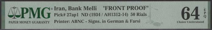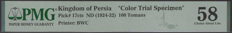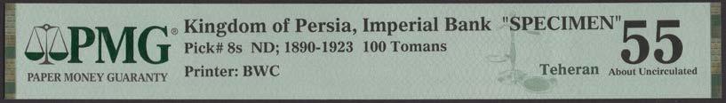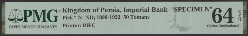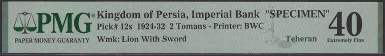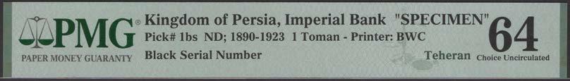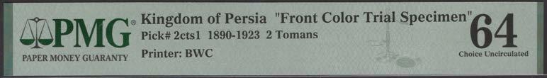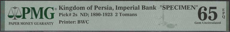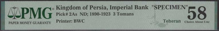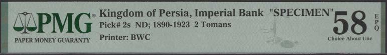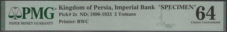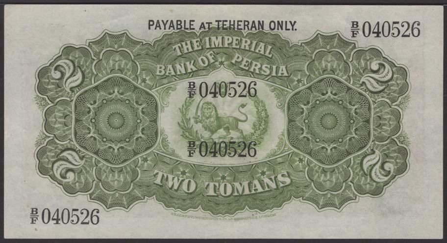 IMPERIAL BANK OF PERSIA , 2 Tomans, Teheran, 1913, black serial number B/F 040526, Dalton and Wood signatures, superb original paper quality, in PMG holder 58, choice about uncirculated, an exceptional example which is only lacking EPQ due to a couple of tiny rust spots, the nest example on the PMG population report and likely one of the nest examples extant BNB B103e, Pick 2