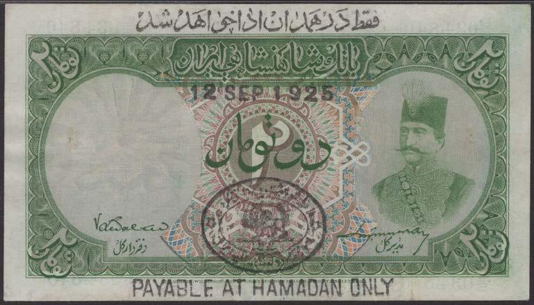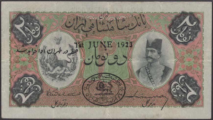 IMPERIAL BANK OF PERSIA , 2 Tomans, Tehran, 28 November 1923, black serial number P/D 077277, Walter and McMurray signatures, minor repairs,in PMG holder 25, very ne, a very rare variety