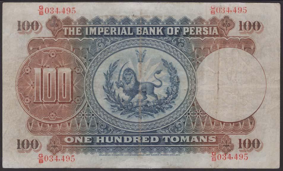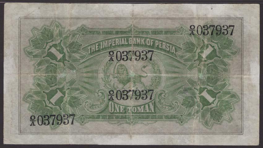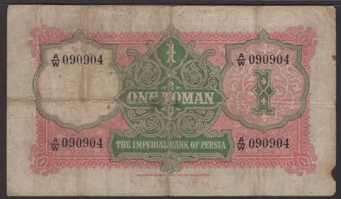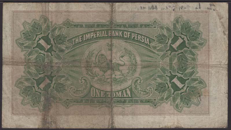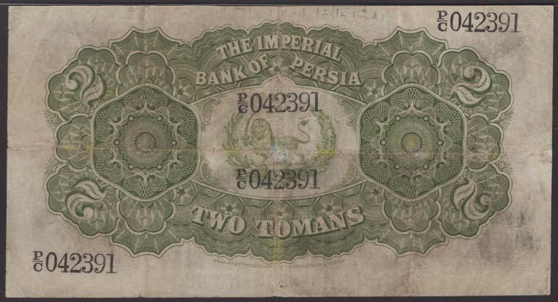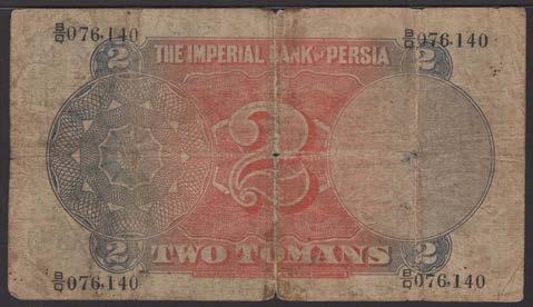 IMPERIAL BANK OF PERSIA , counterfeit 2 Tomans, Meshed, 21 July 1912, serial number P/A 009683, Dalton and Wood signatures, split and rejoined, stains at centre line, very good to ne, scarce