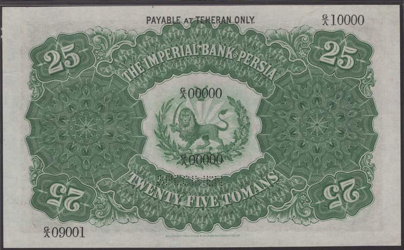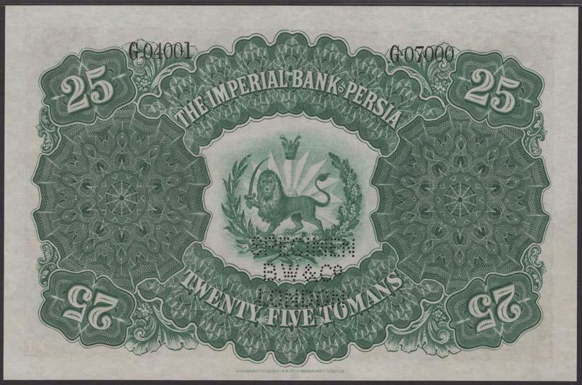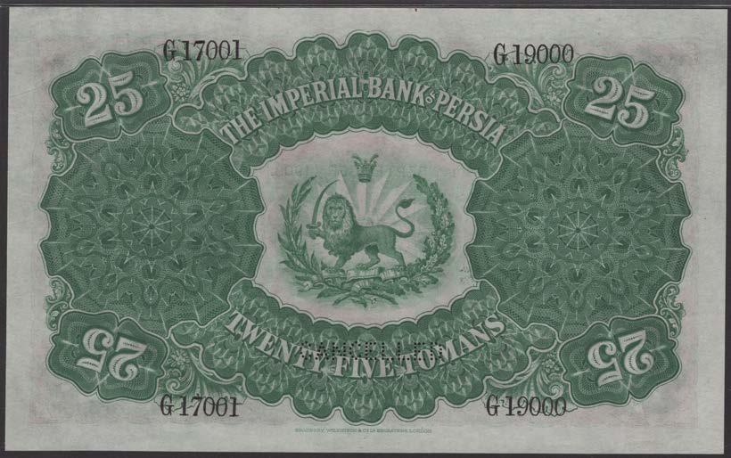 6 X IMPERIAL BANK OF PERSIA , 1 Toman, Resht, 10 October 1919, black serial number O/A 037937, Dalton and Wood signatures, minor repairs, in PMG holder 25, very ne, a fresh and clean looking example of a scarce branch of issue BNB B102g20, Pick 1b £1,000-£1,500