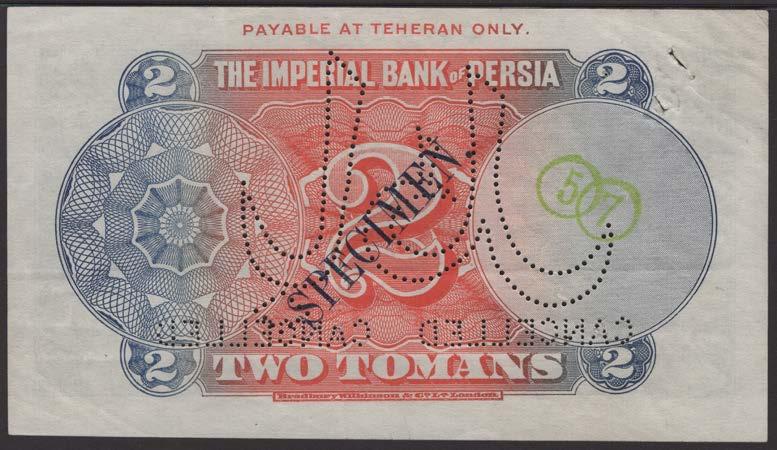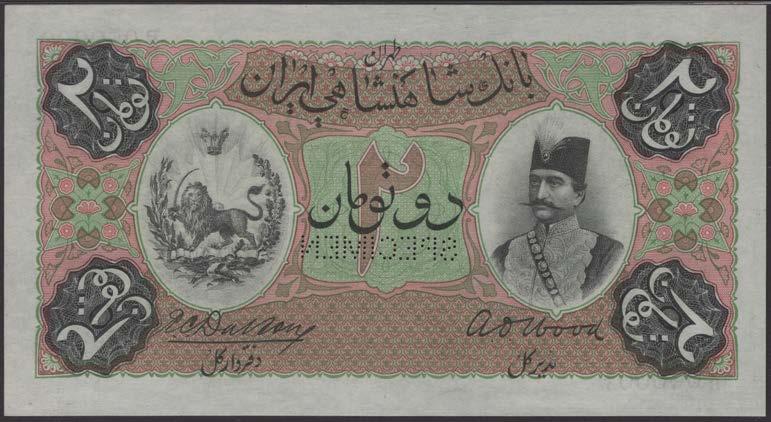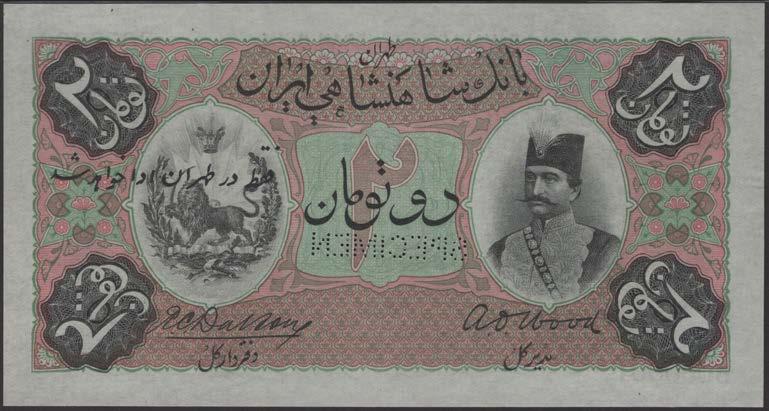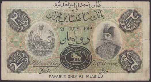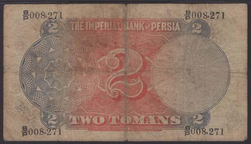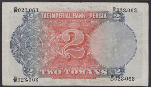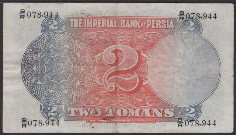 IMPERIAL BANK OF PERSIA , counterfeit 2 Tomans, Meshed, 21 July 1912, serial number L/H 002406, Dalton and Wood signatures, ne and scarce