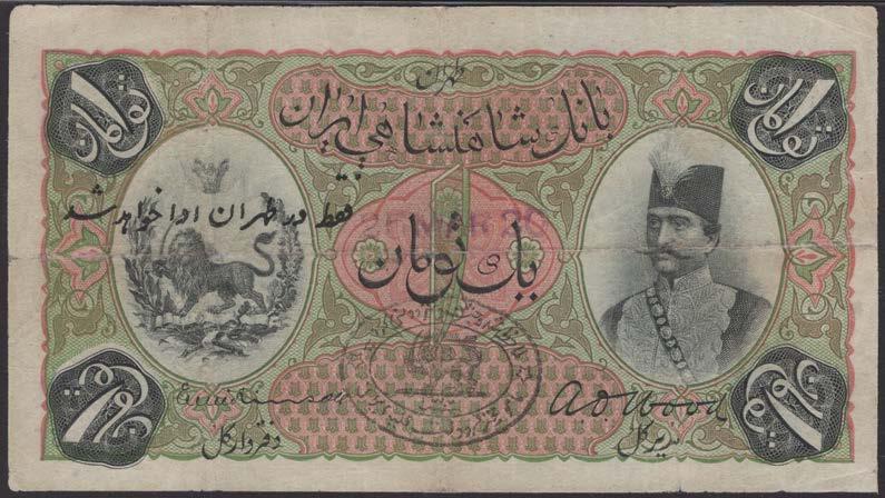IMPERIAL BANK OF PERSIA , cancelled 1 Toman, Kermanshah, 8 August 1908, red serial number