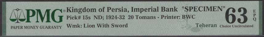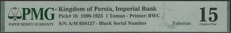 IMPERIAL BANK OF PERSIA , 1 Toman, Teheran, 25 March 1920, black serial number A/M 056127, Wilkinson and Wood signatures, professionally repaired, in PMG holder 15, choice ne, a very scarce late signature type and an attractive and clean example